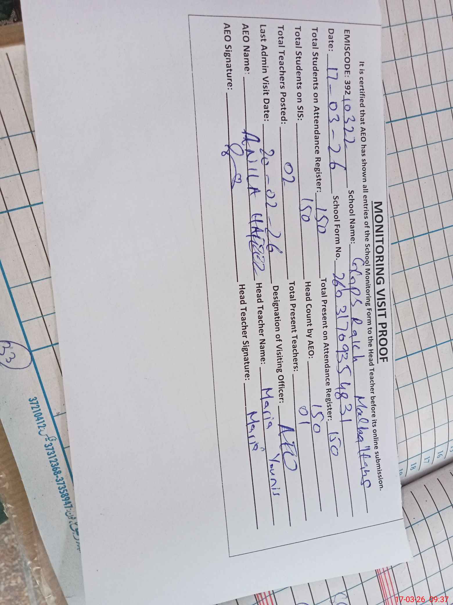 | Attendance Register | Head Teacher | MEA with School | Visit Proof |