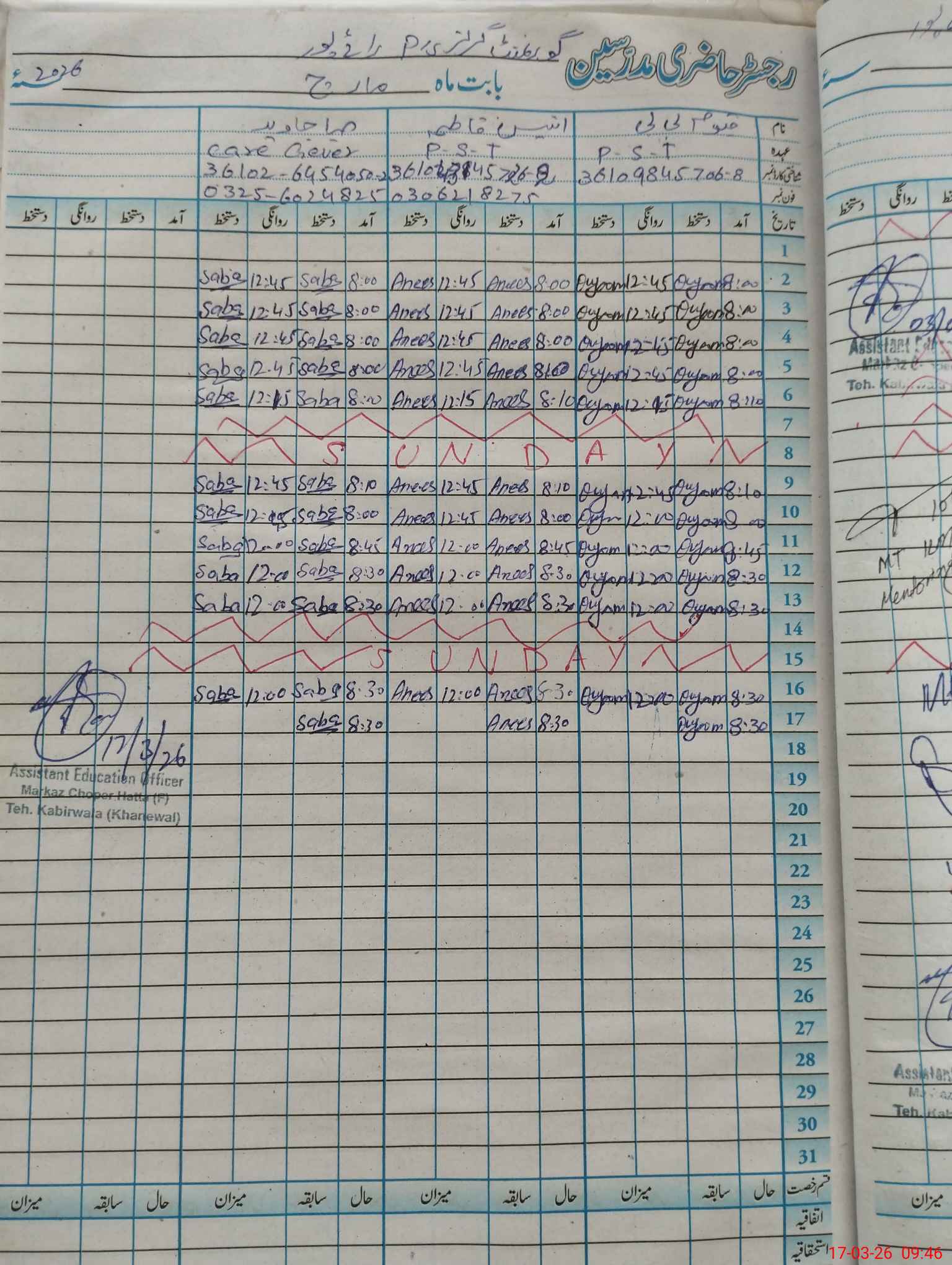 | District: KHANEWAL | Tehsil: KABIRWALA | Markaz: CHOPAR HATTA - FEMALE | Level: Primary | |