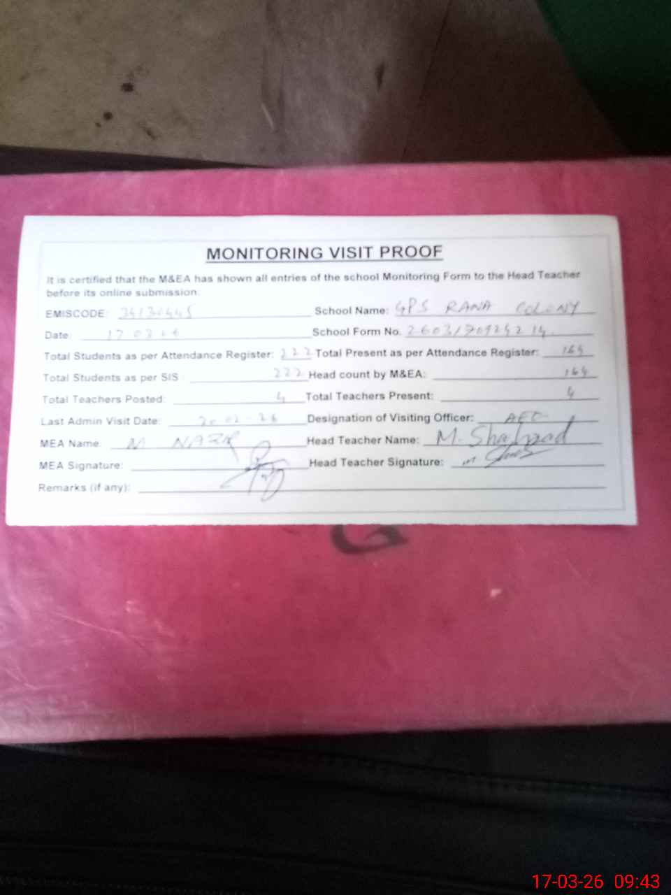 | Attendance Register | Head Teacher | MEA with School | Visit Proof |