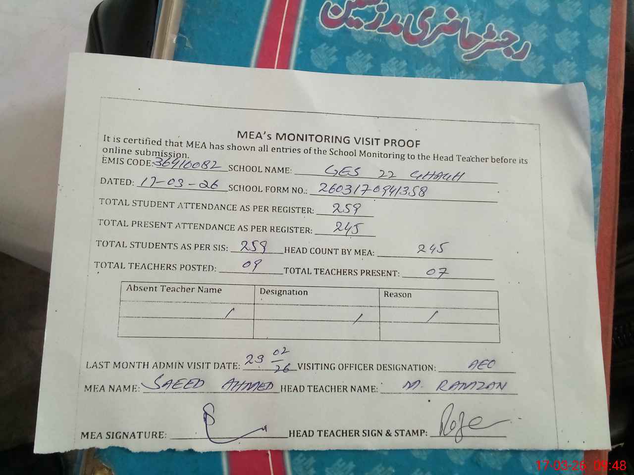 | Attendance Register | Head Teacher | MEA with School | Visit Proof |