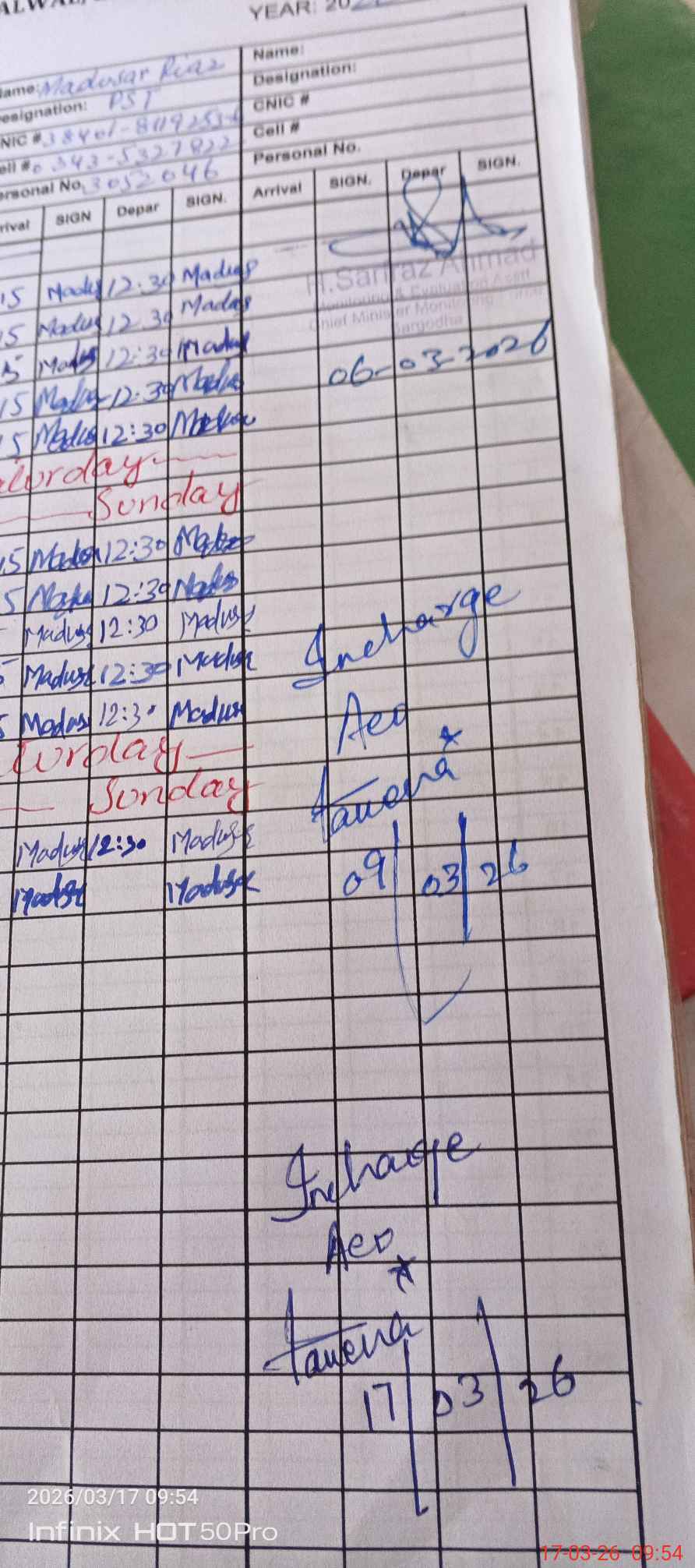 | CNIC | Full Name | Designation | R/C | Absence during last cal. month |