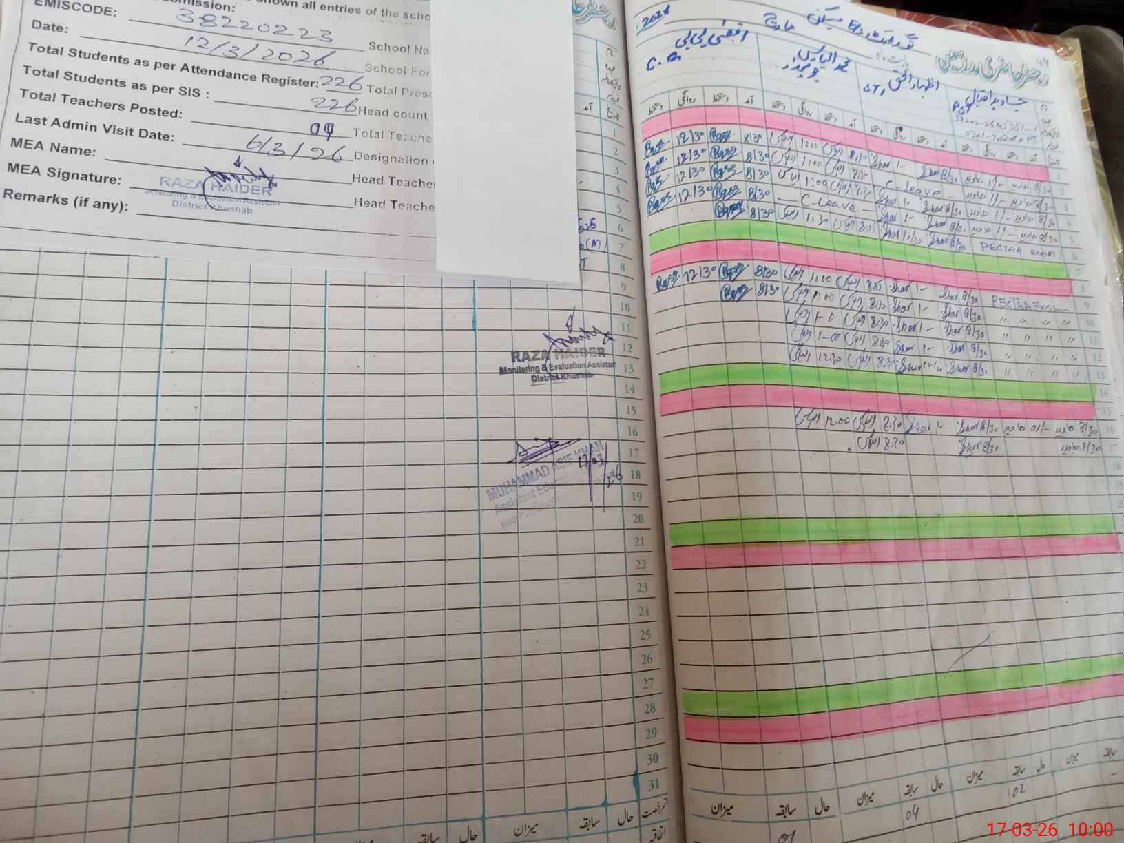 | Attendance Register | Head Teacher | MEA with School | Visit Proof |
