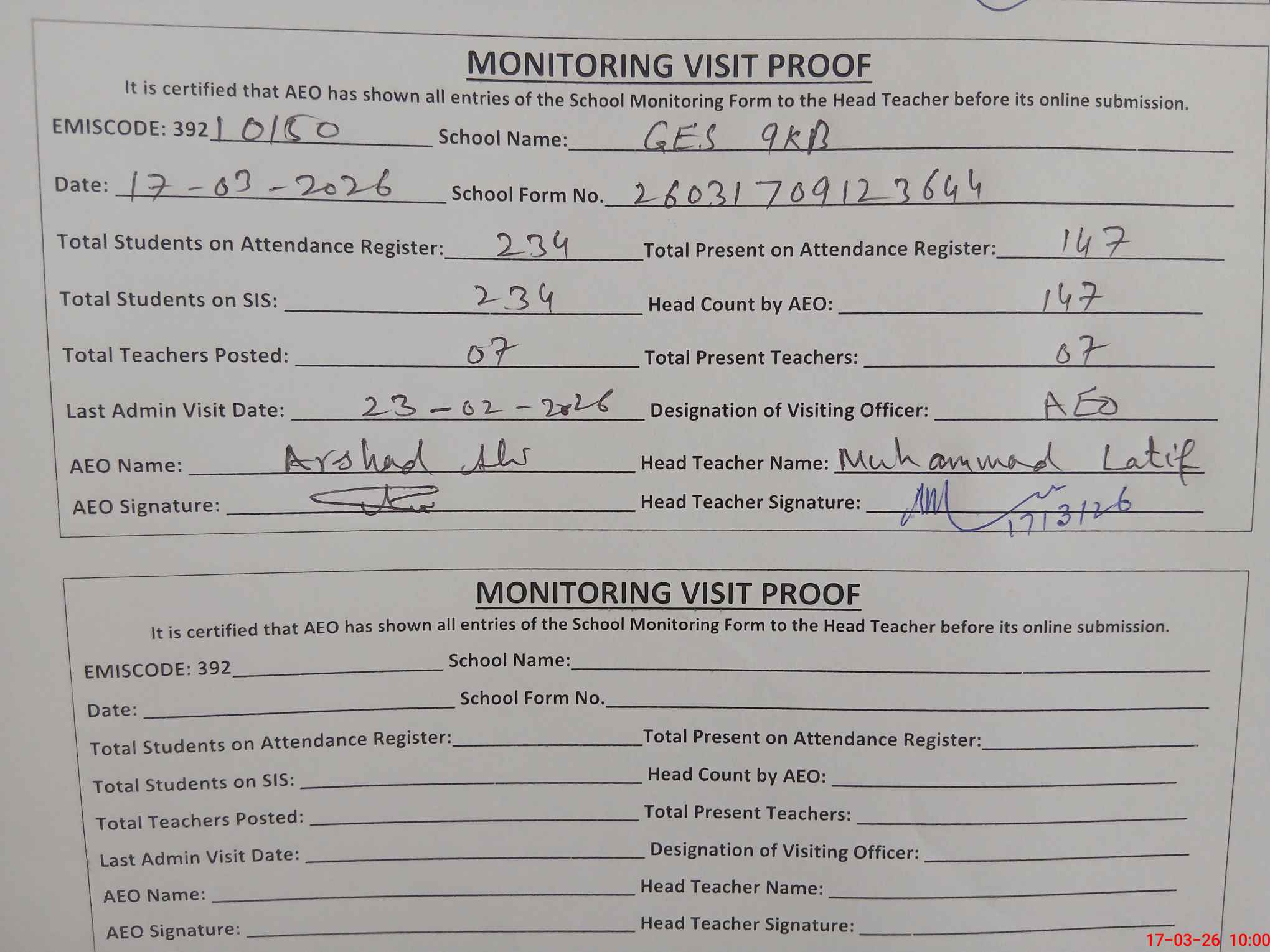 | Attendance Register | Head Teacher | MEA with School | Visit Proof |