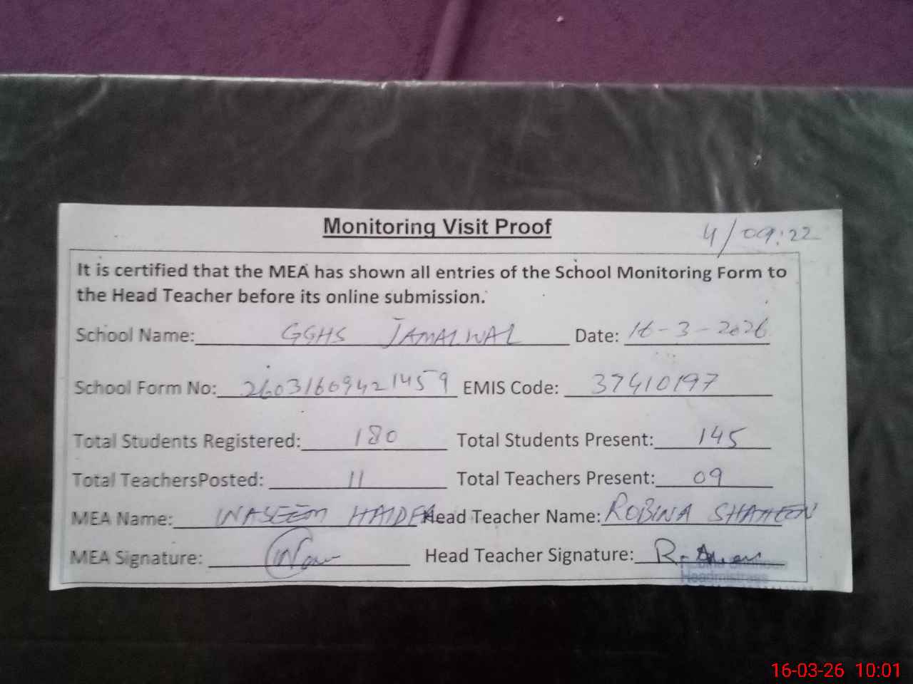 | EMIS Code: 37410197 | Name of School: GGHS JAMALWAL | |||