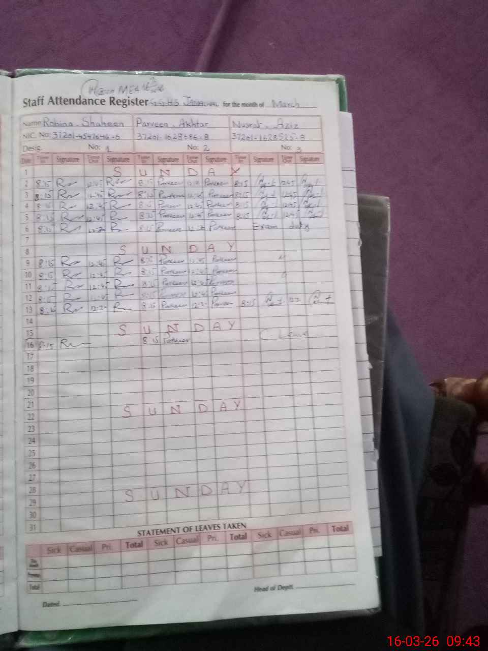 | Remarks (Use Separate Page if Required): Ece class was on leave due to off from paper est Nusrat was marked on leave but no approved online record was available pst Bushra was marked on leave but at ten o clock during visit leave was approved so I marked unauthorized both teachers | |||||