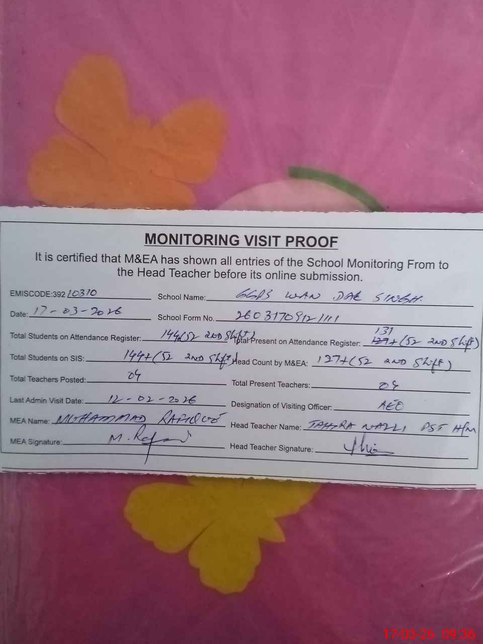 | Attendance Register | Head Teacher | MEA with School | Visit Proof |