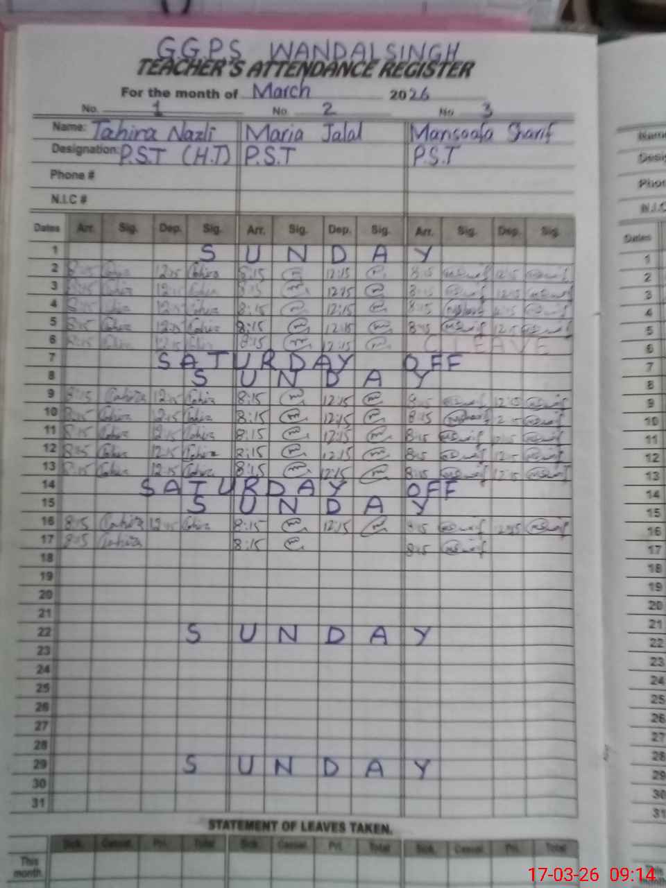 | Name: TA**** NA**** Designation: (School Headmaster's/Headmistress's) PST Phone/Cell Number: 03**** |
