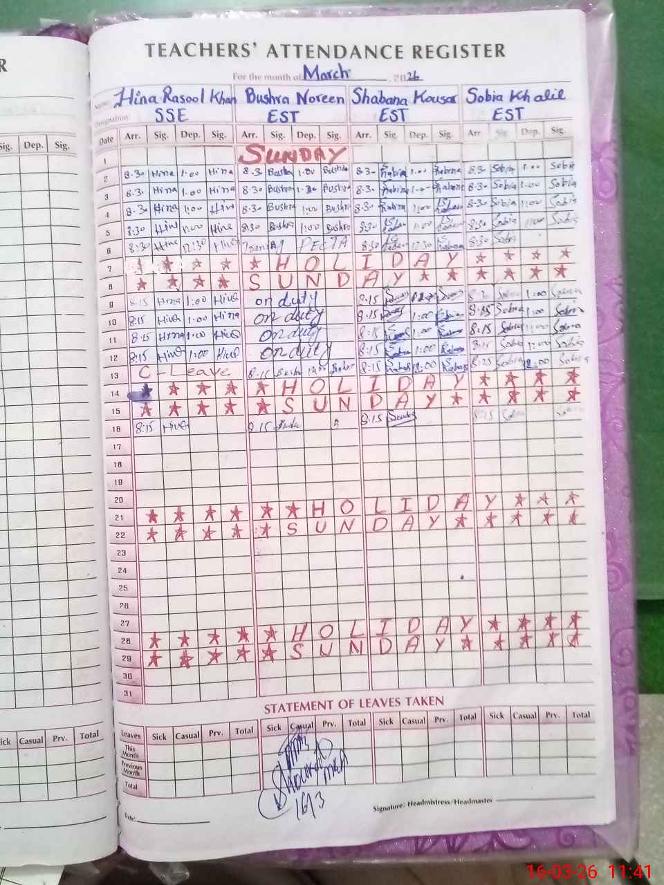 | Remarks (Use Separate Page if Required): Govet Punjab has alloted leaves for the class of ECCE and Nursery but Headmistress sahiba has not permitted to leave these classes. the NSB and FTF record was not updated | |||||