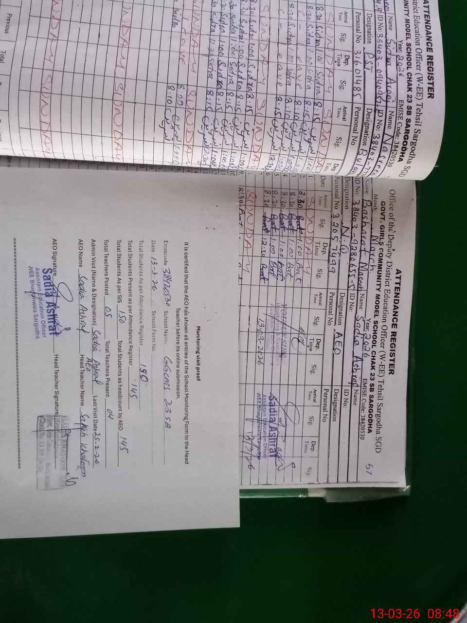 | Monitoring Date: 13-03-2026 | Start Time: 13-03-2026 08:20 PM | End Time: 13-03-2026 08:48 AM | Name of MEA: Sa**** As**** | |
