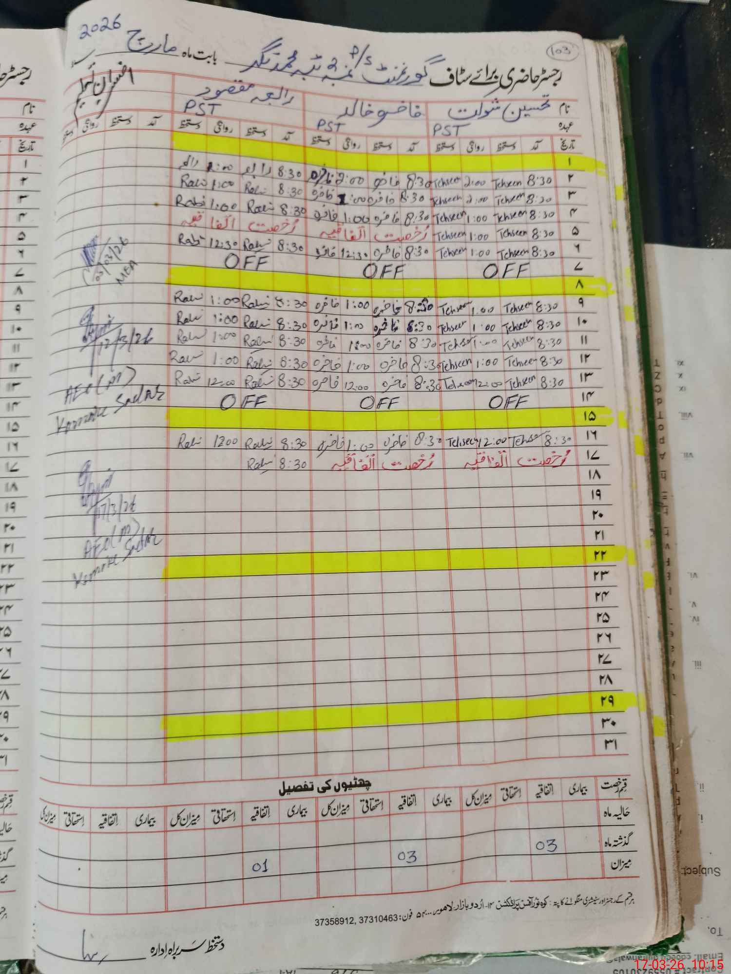 | CNIC | Full Name | Designation | R/C | Absence During Last Calender Month |