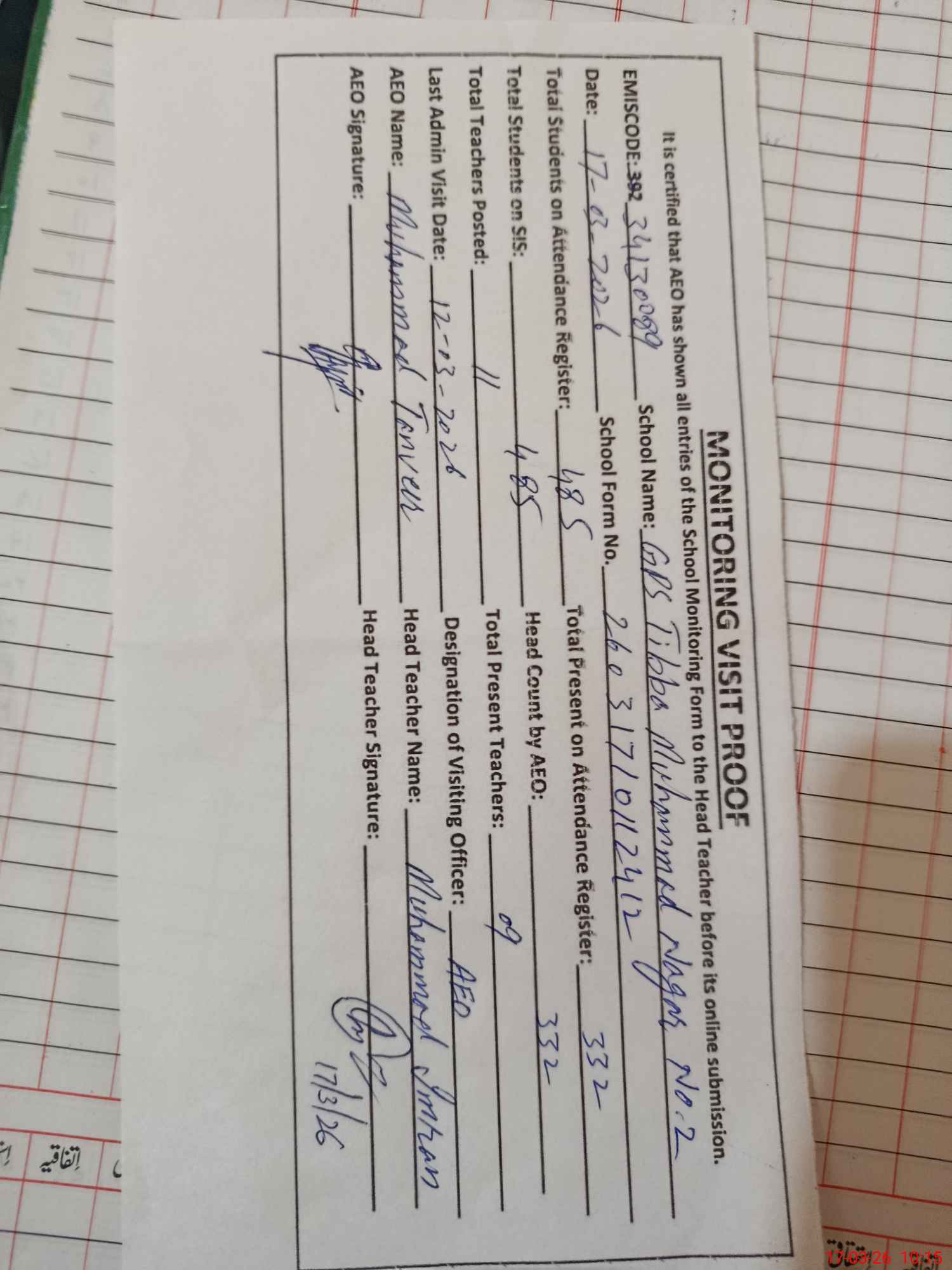 | Name: MU**** IM**** Designation: (School Headmaster's/Headmistress's) PTC/JV Phone/Cell Number: 03**** |