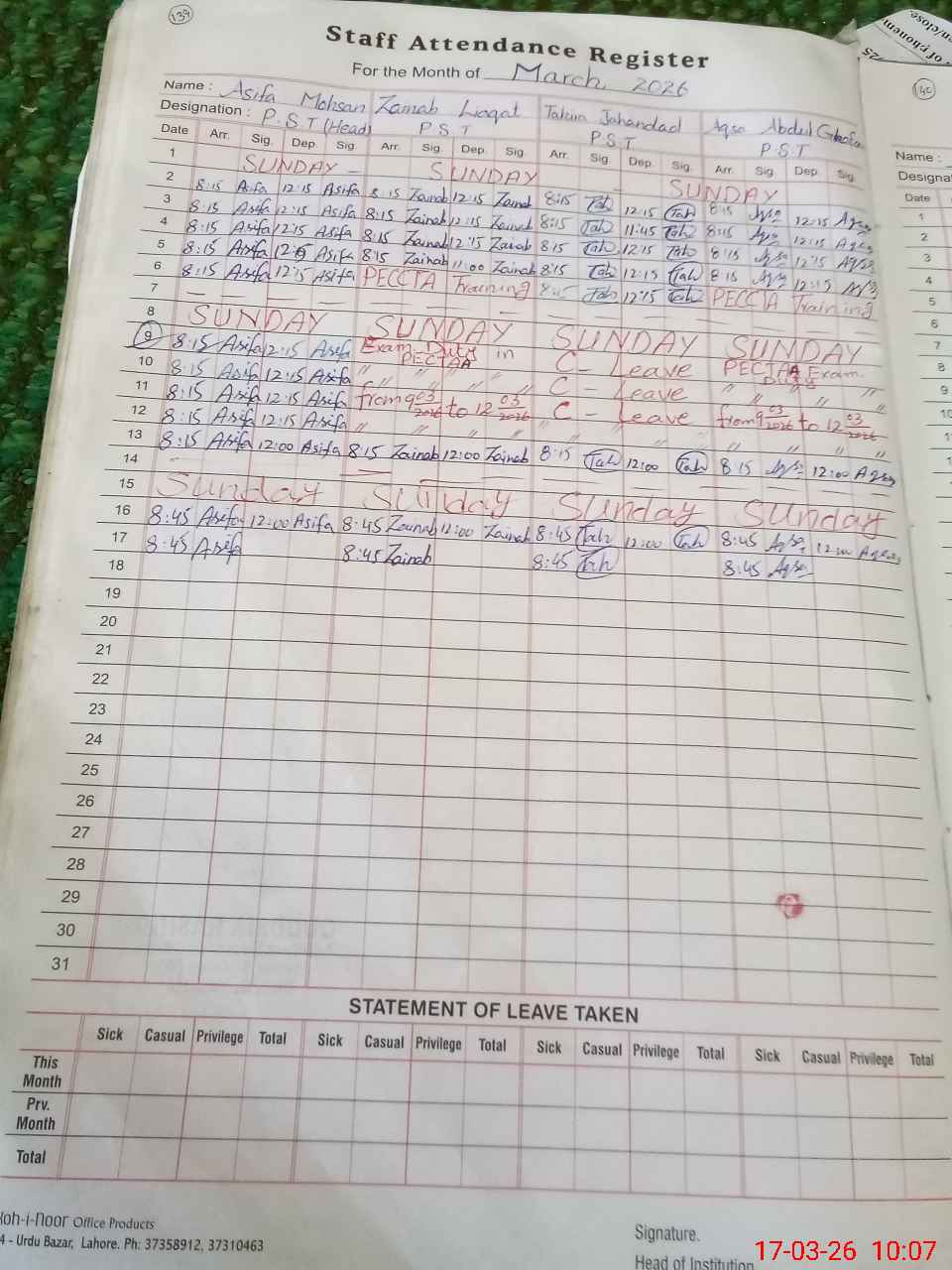 | CNIC | Full Name | Designation | R/C | Absence During Last Calender Month |