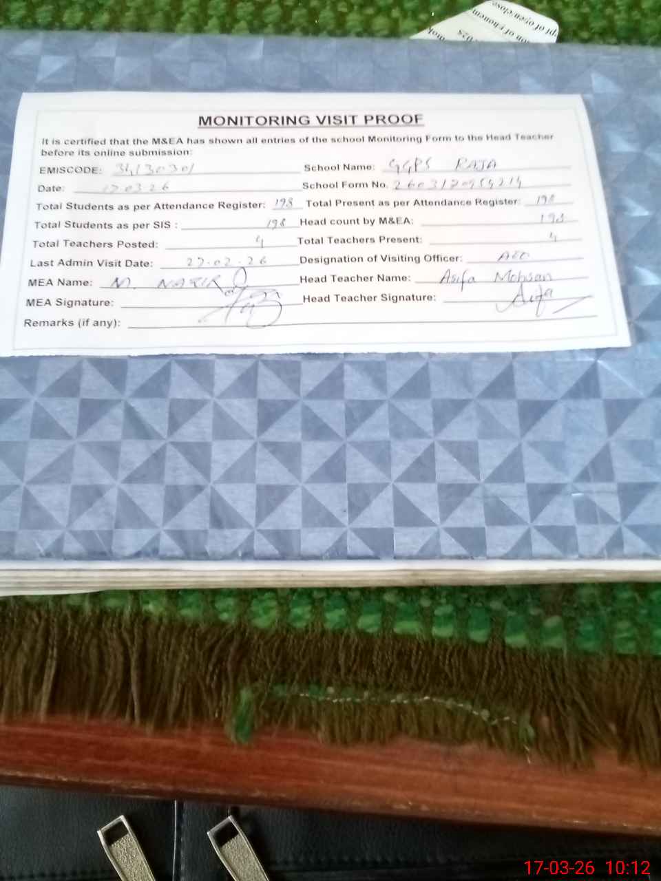 | Attendance Register | Head Teacher | MEA with School | Visit Proof |