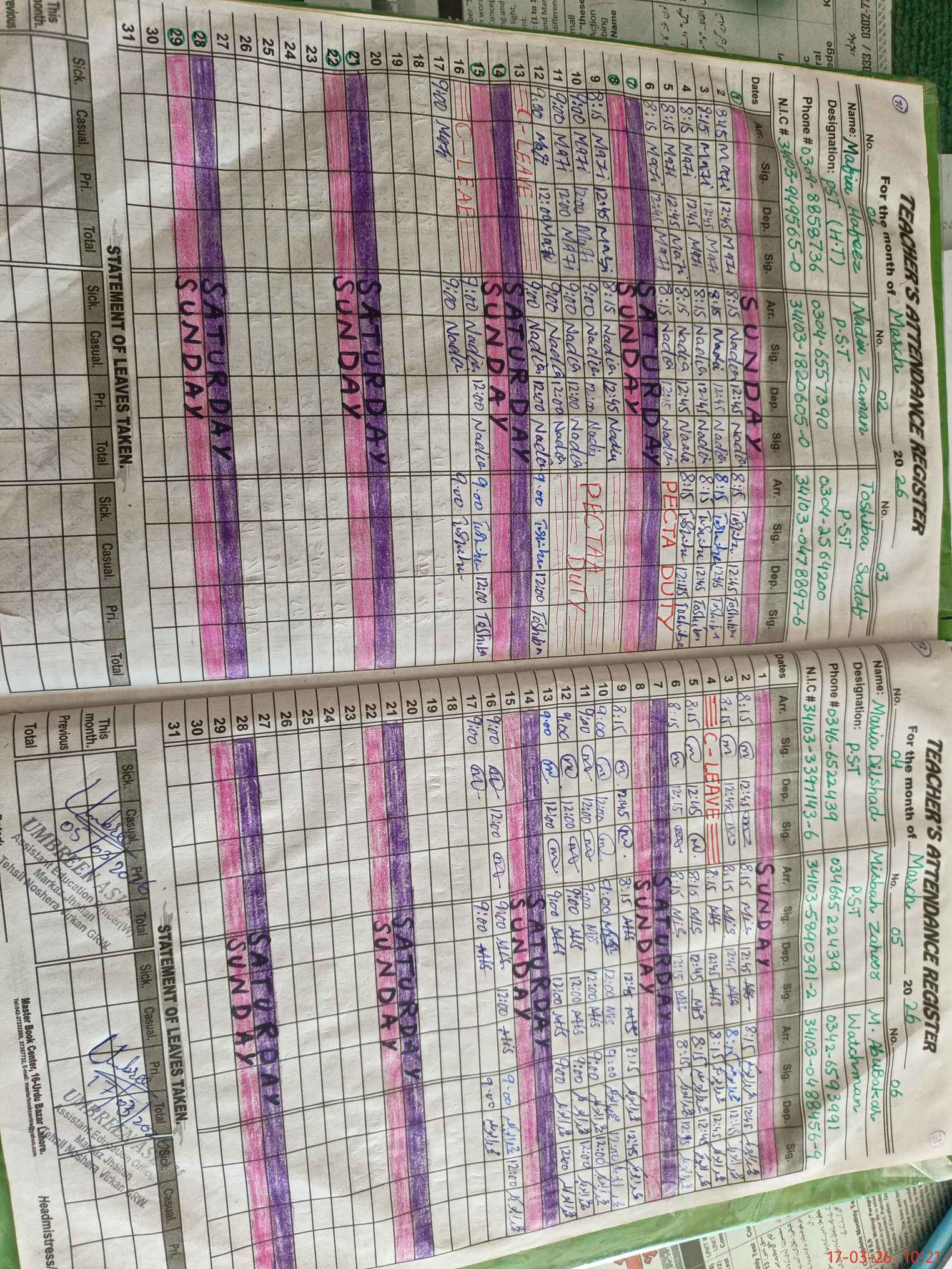 | CNIC | Full Name | Designation | R/C | Absence During Last Calender Month |