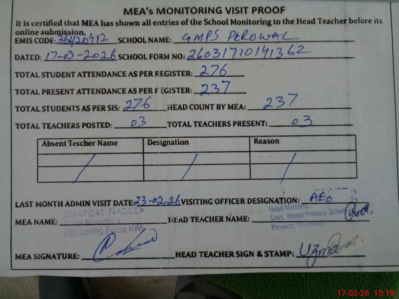 | EMIS Code: 36420412 | Name of School: GPS MODEL PEROWAL, KHANEWAL | |||