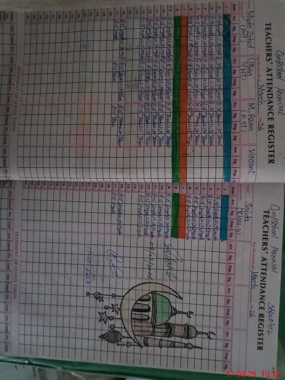 | Remarks (Use Separate Page if Required): 1. Narsury classes exam off attendence taken from roznamcha 2. 7th class online attendence taken from previous day attendence register | |||||