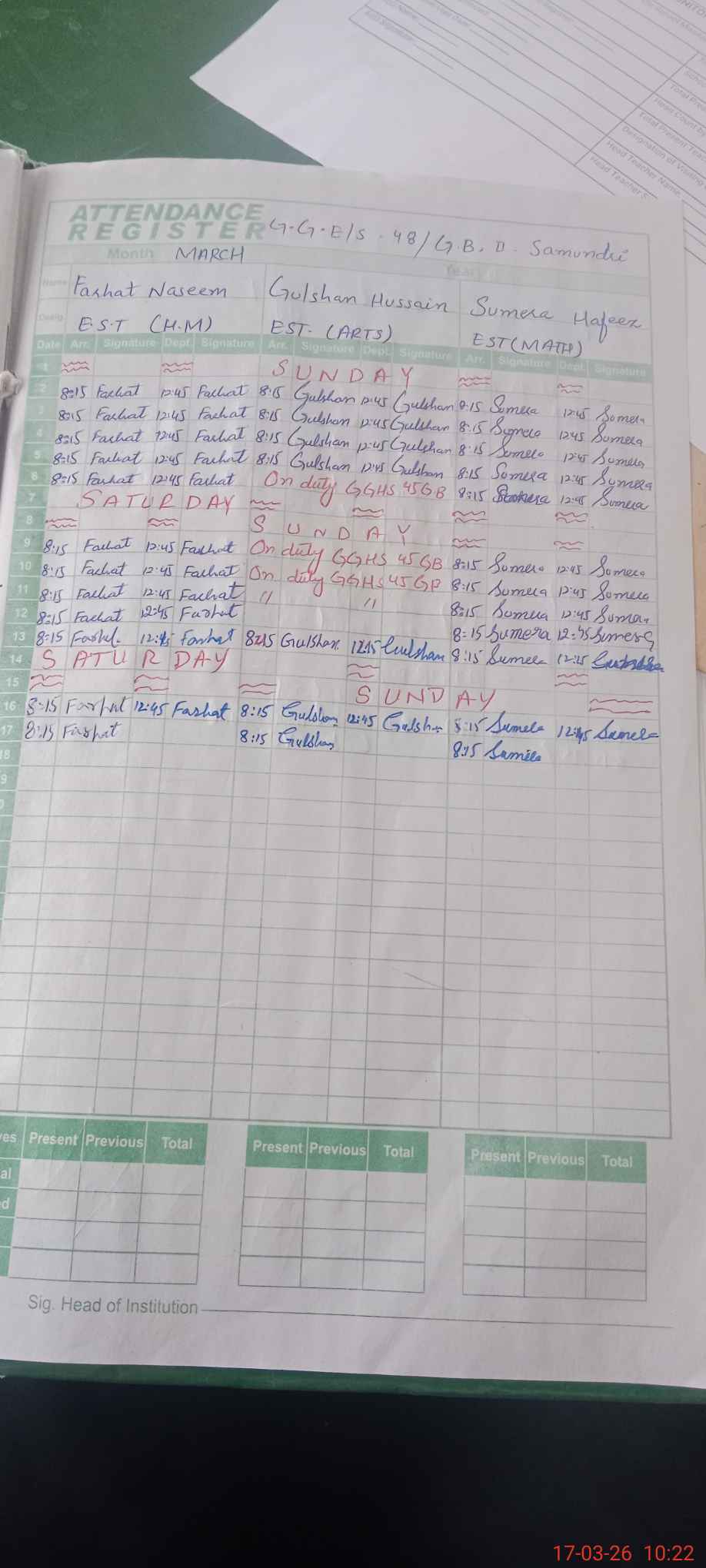 | No. of Students Present - Female | 0 | 0 | 0 | 0 | 0 | 0 | 0 | 32 | 32 | 30 | 94 | |||||