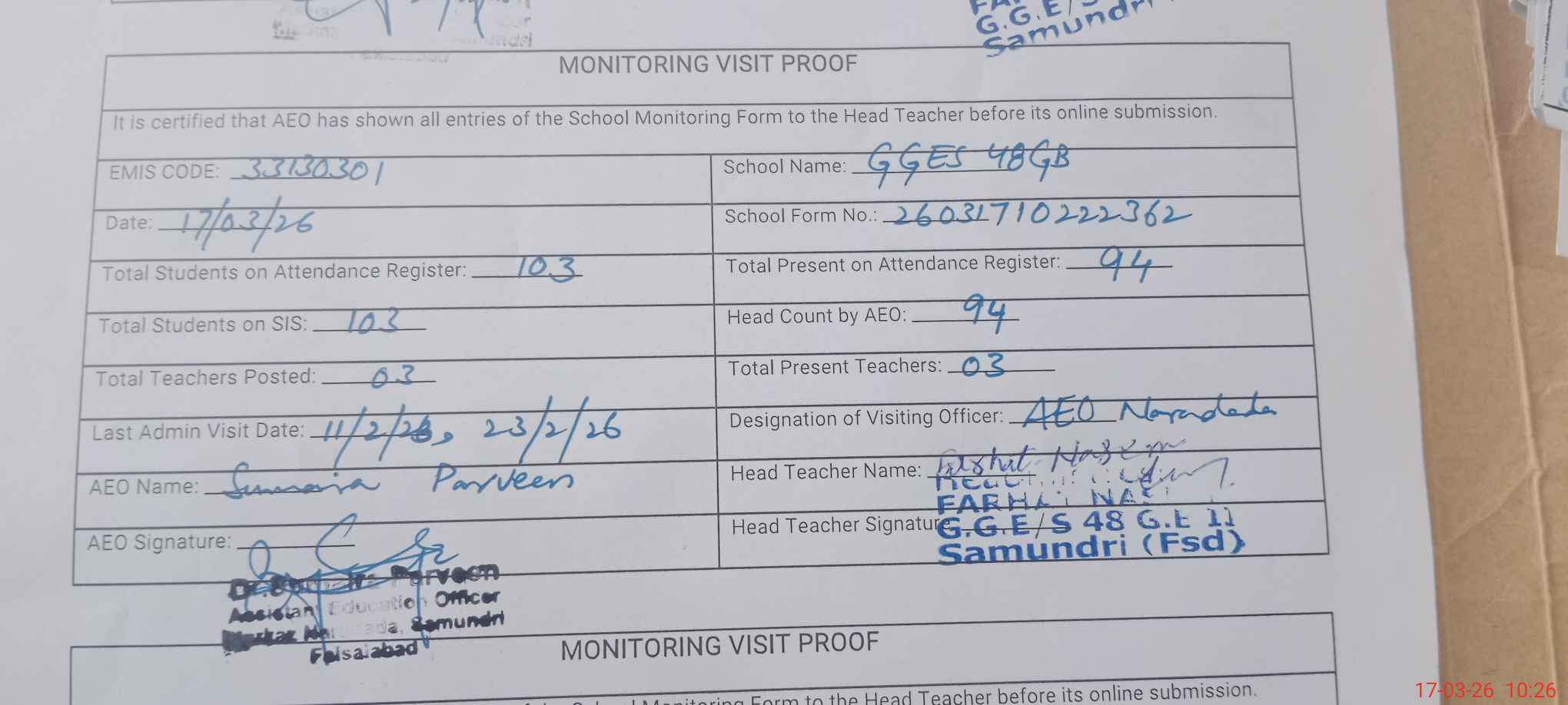 | Attendance Register | Head Teacher | MEA with School | Visit Proof |