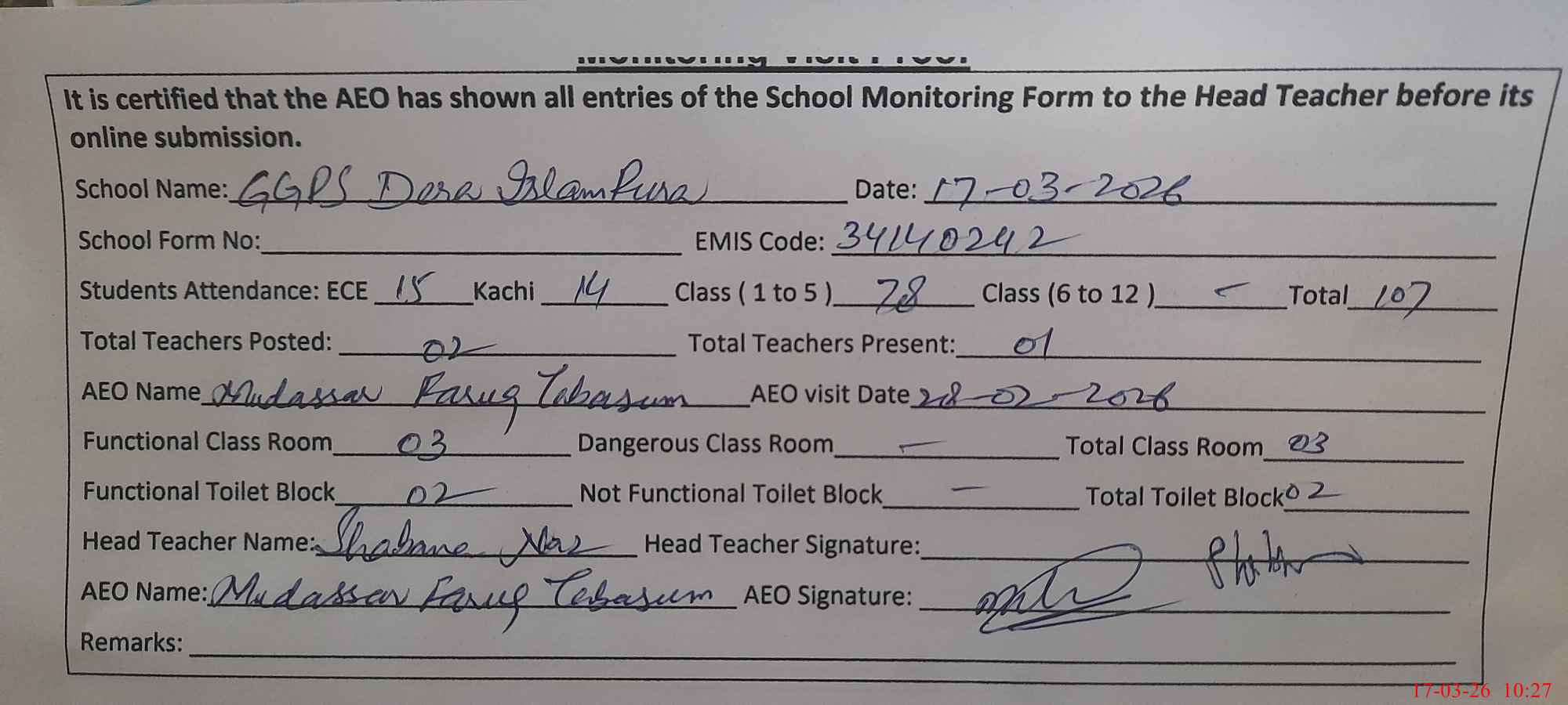 | EMIS Code: 34140242 | Name of School: GGPS DERA ISLAM PURA | |||