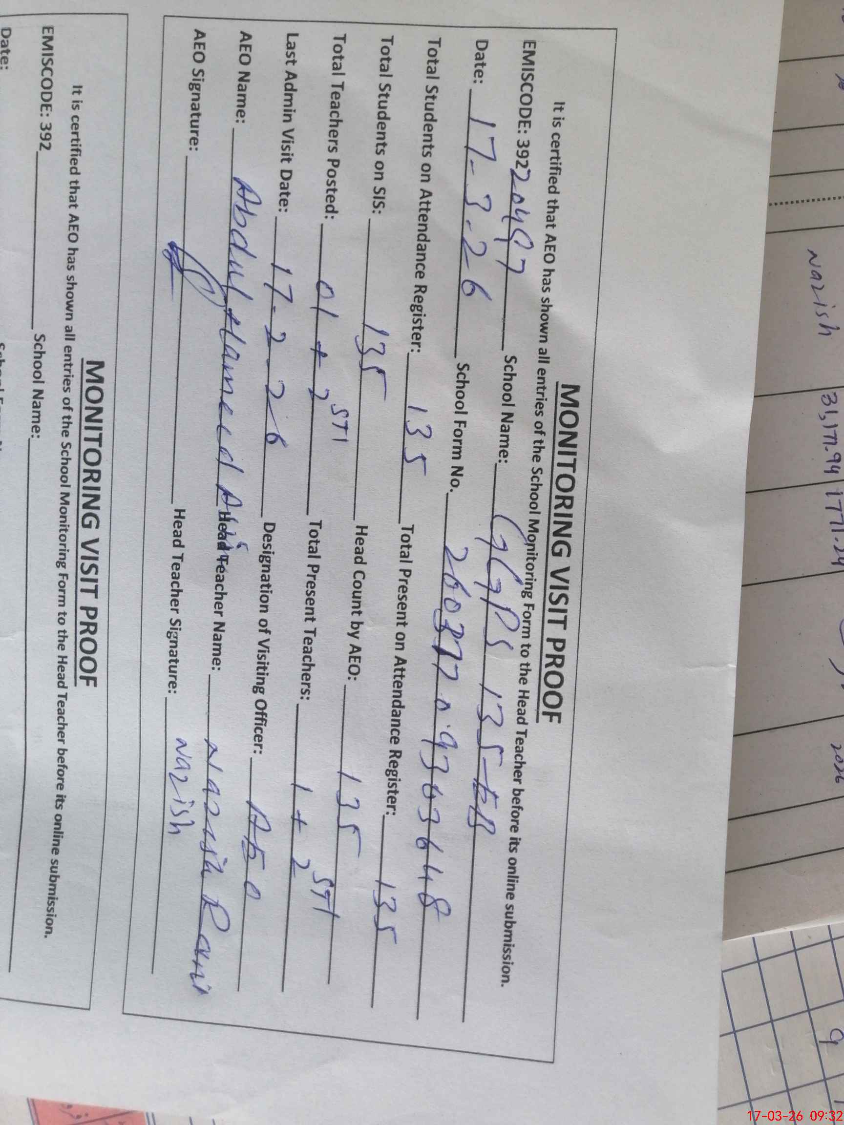 | Attendance Register | Head Teacher | MEA with School | Visit Proof |