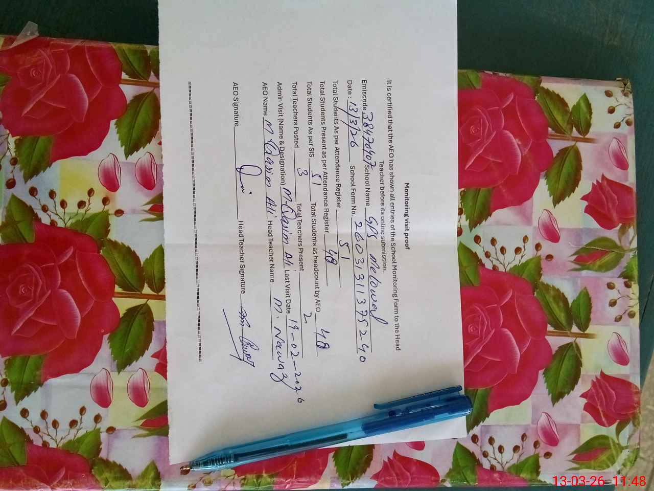 | Certified that this School was Inspected by the Undersigned MEA/DMO Today and the Information Stated Above is as Per Record. | |||||