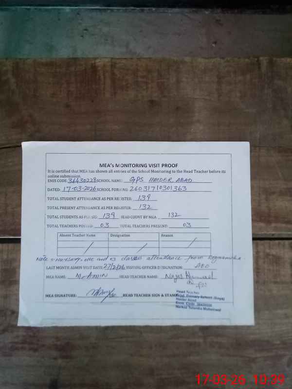 | EMIS Code: 36430228 | Name of School: GPS HAIDER ABAD, TULAMBA | |||