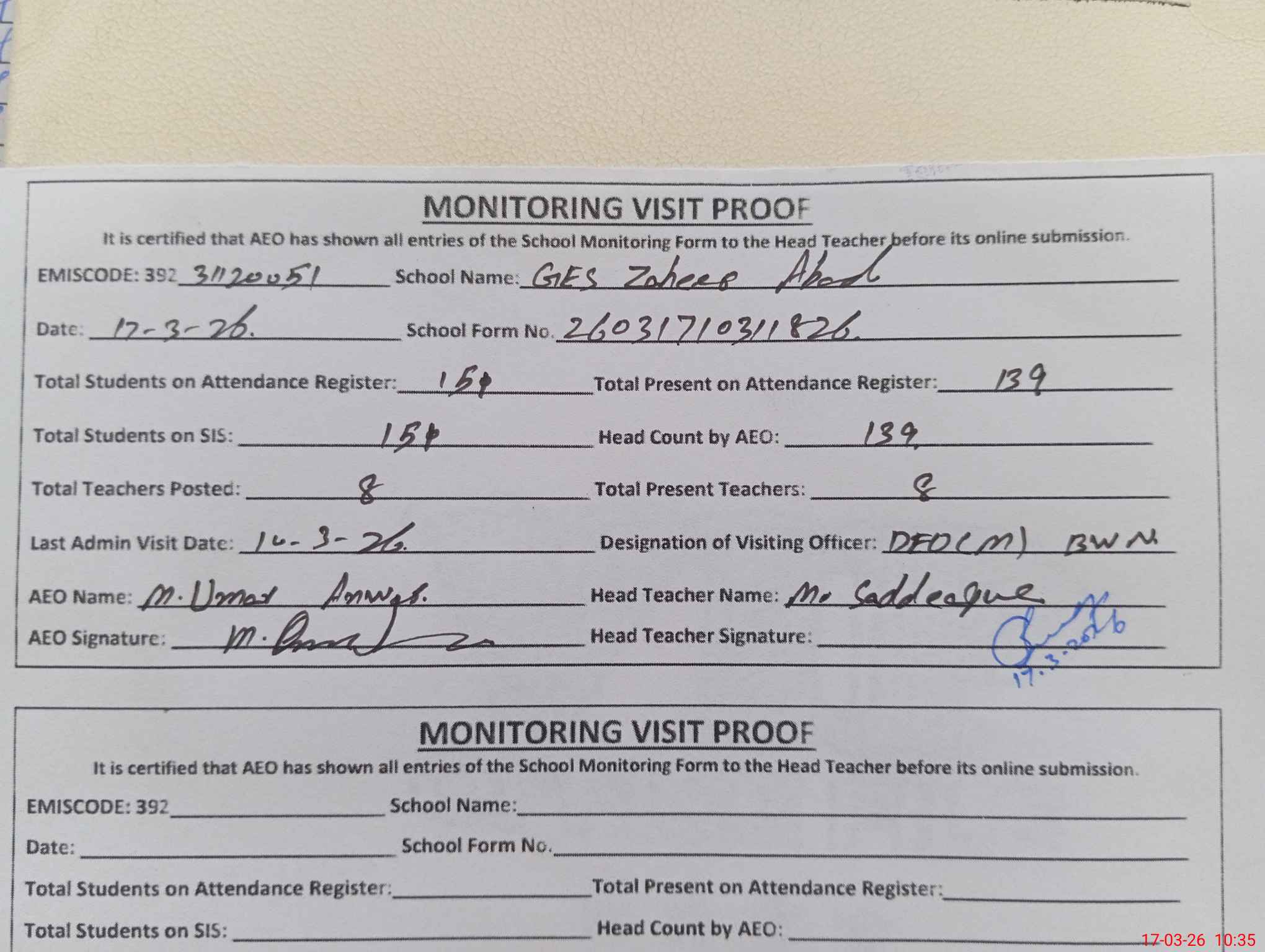 | EMIS Code: 31120051 | Name of School: GES ZAHEER ABAD CHISHTIAN | |||