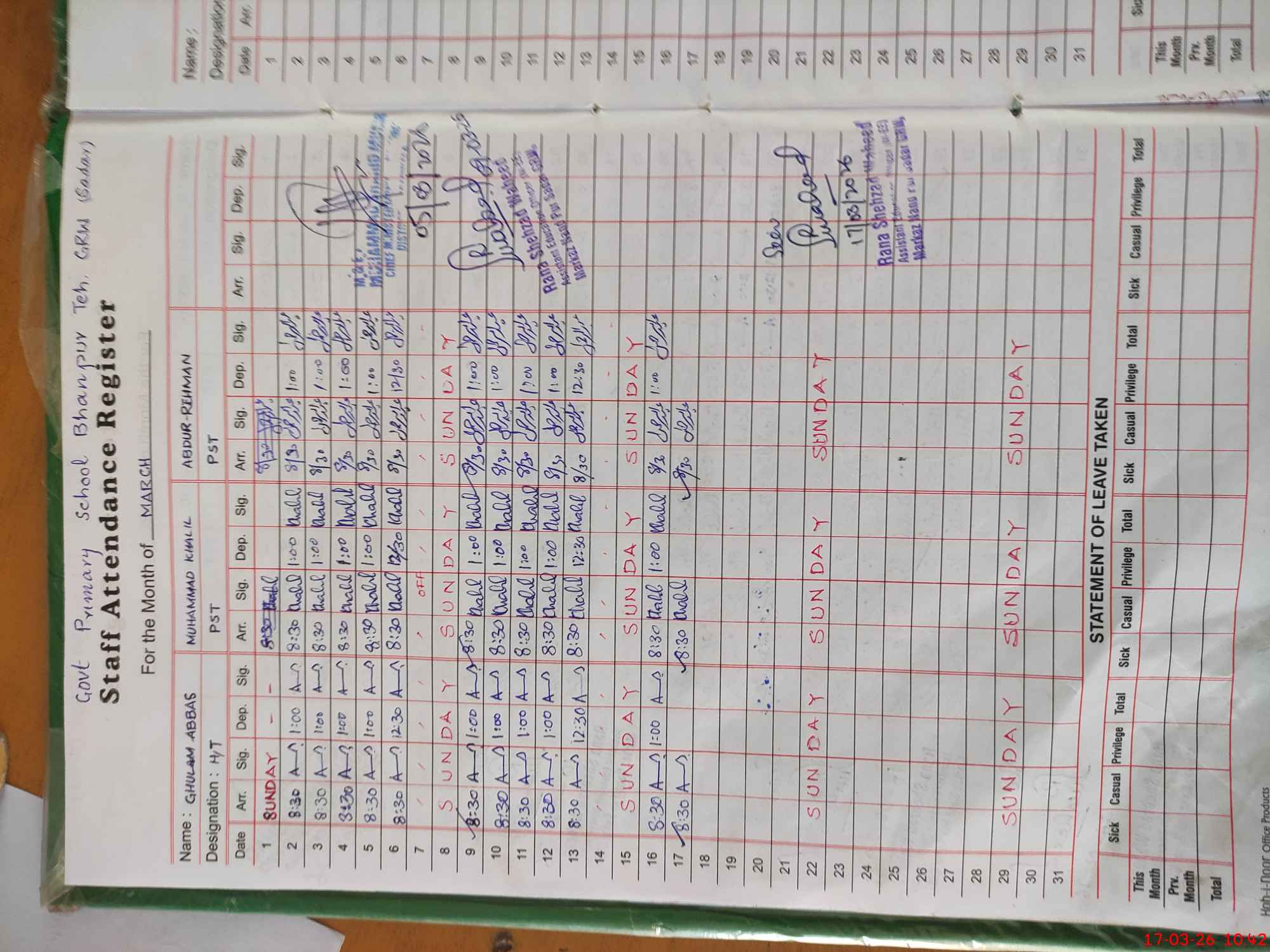 | CNIC | Full Name | Designation | R/C | Absence During Last Calender Month |