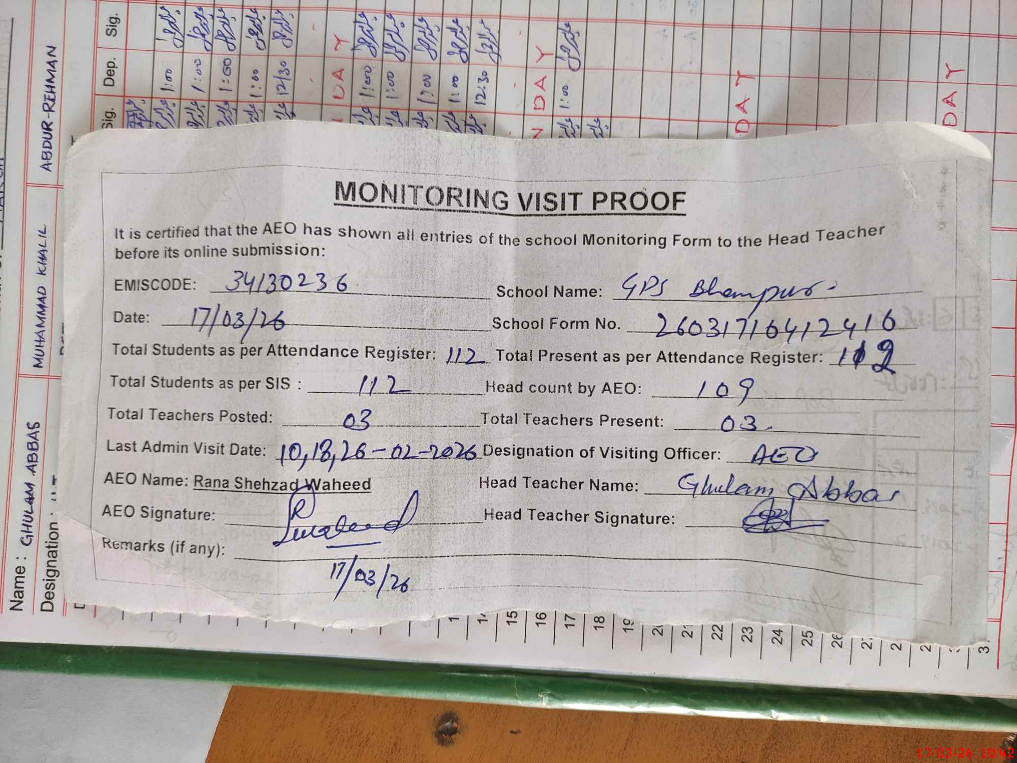 | Attendance Register | Head Teacher | MEA with School | Visit Proof |