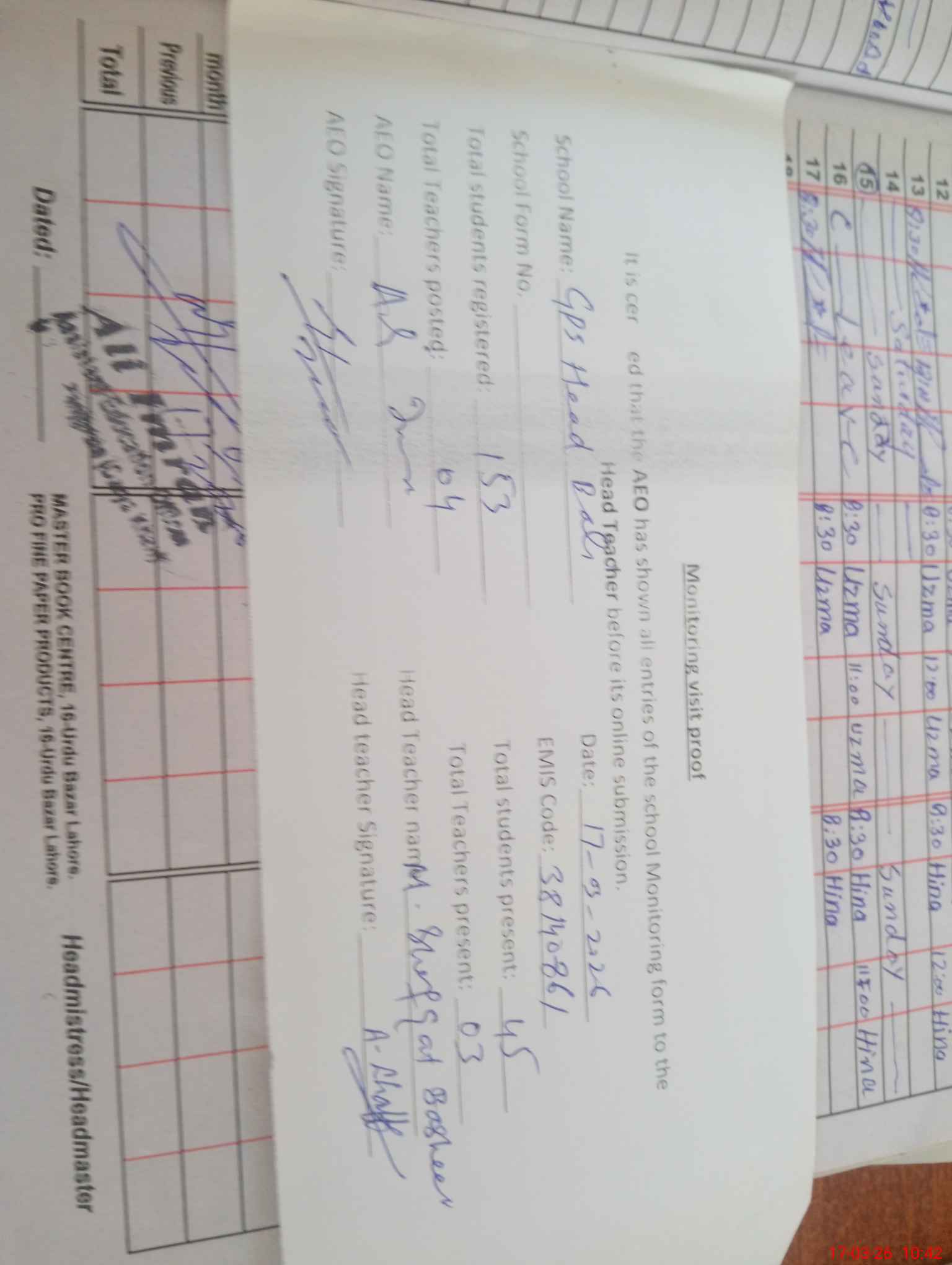 | Attendance Register | Head Teacher | MEA with School | Visit Proof |