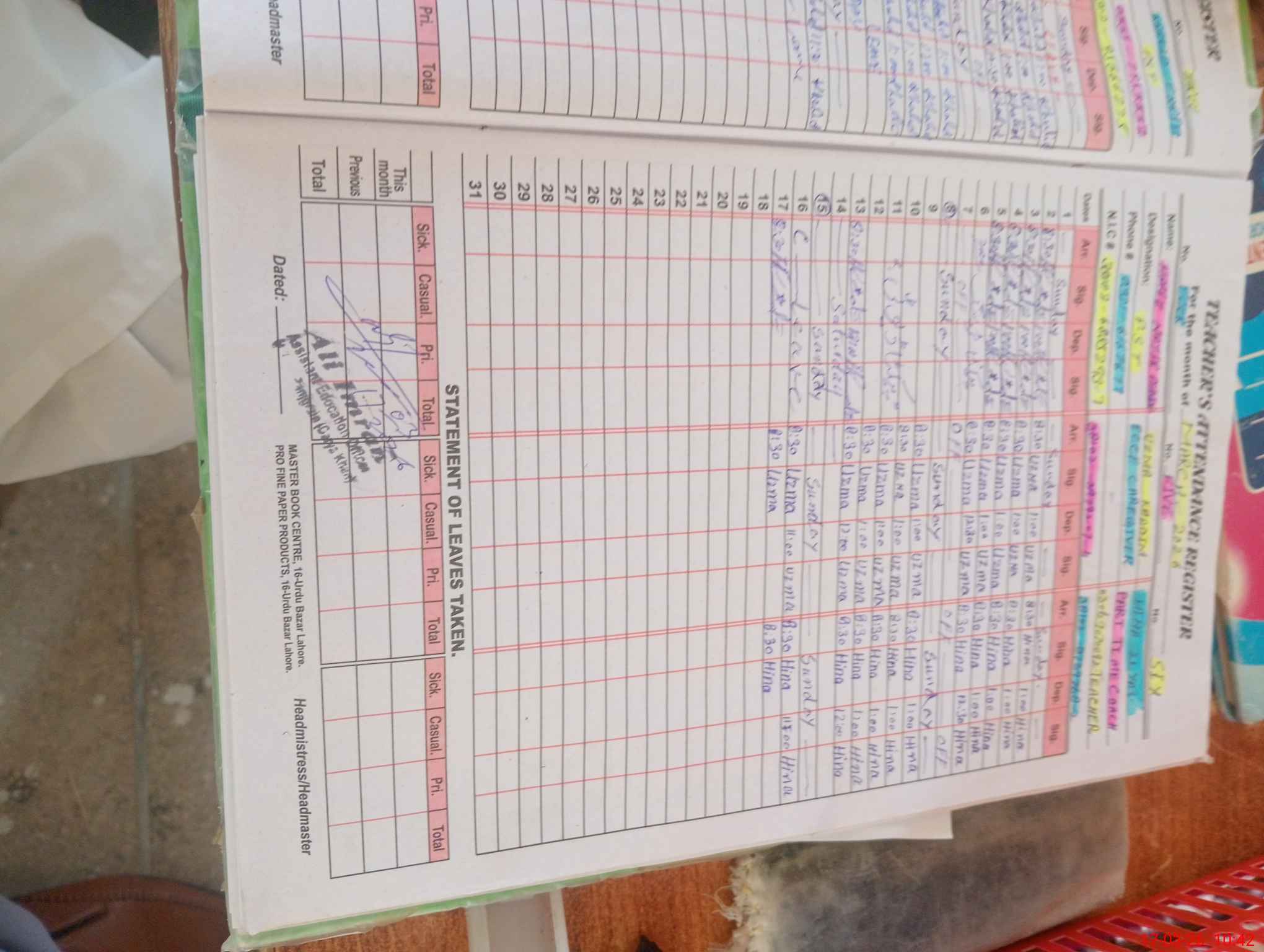 | CNIC | Full Name | Designation | R/C | Absence During Last Calender Month |