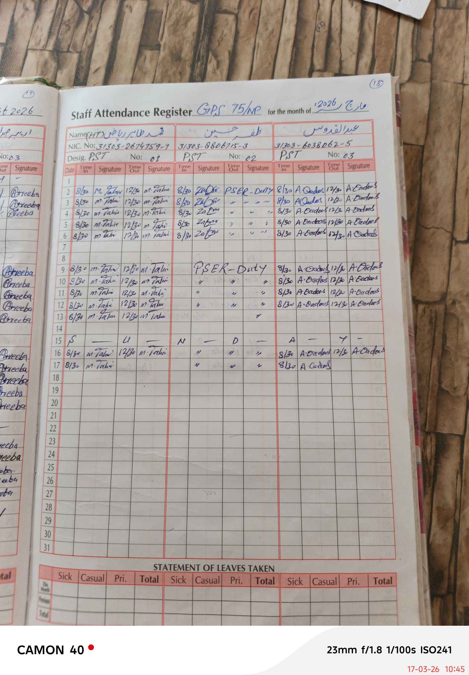 | CNIC | Full Name | Designation | R/C | Absence During Last Calender Month |