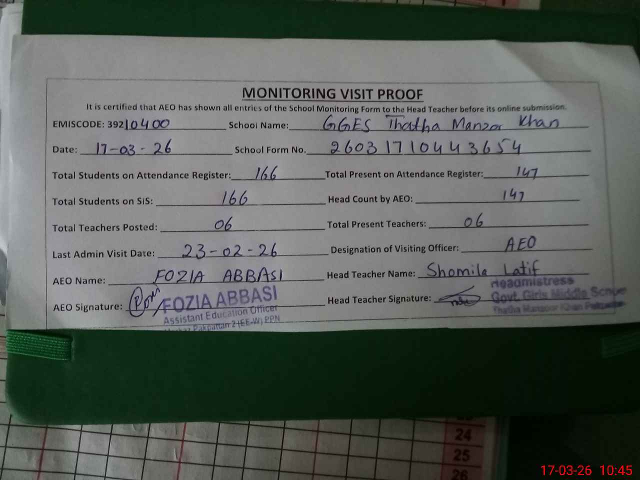 | Attendance Register | Head Teacher | MEA with School | Visit Proof |