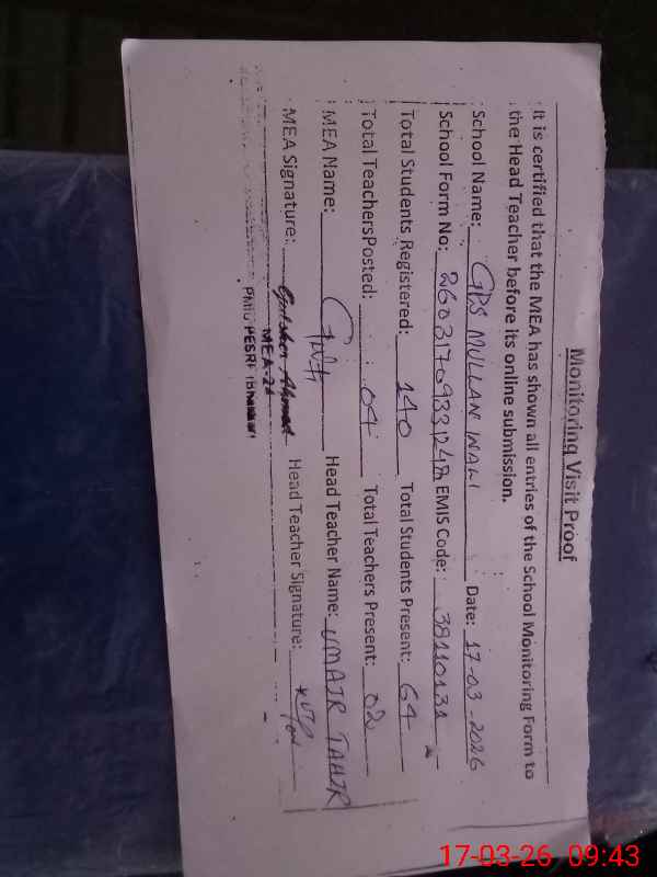 | EMIS Code: 38110131 | Name of School: GPS MULLAN WALI | |||