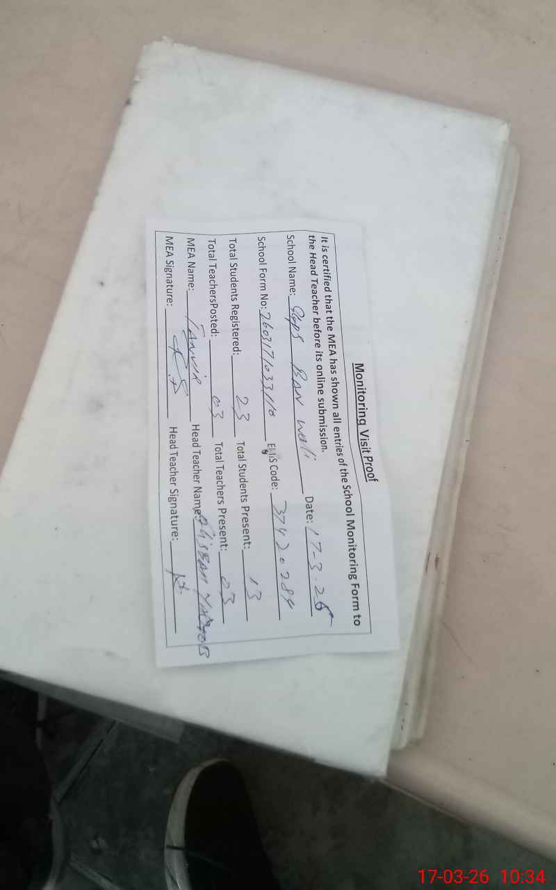| Remarks (Use Separate Page if Required): SBA of 9 Students conducted today but present students are 04 of class two,,,, School is Running in the house of SHO Zahid Iqbal police Station Wanhar Buchal kalan due to building declared dangerous by Education department administration | |||||