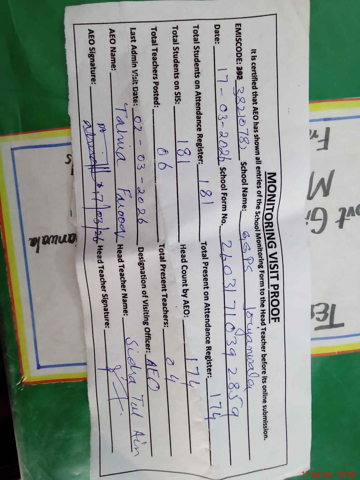 | Attendance Register | Head Teacher | MEA with School | Visit Proof |