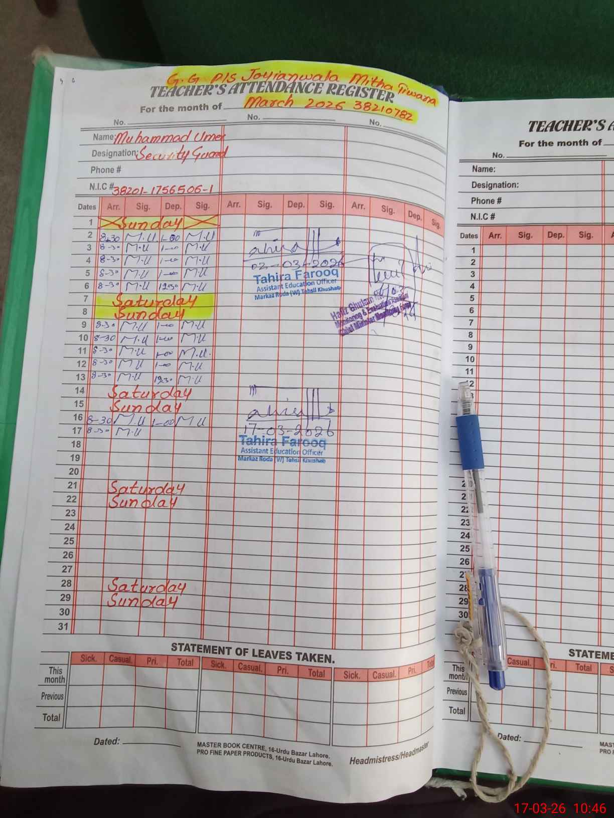 | CNIC | Full Name | Designation | R/C | Absence During Last Calender Month |