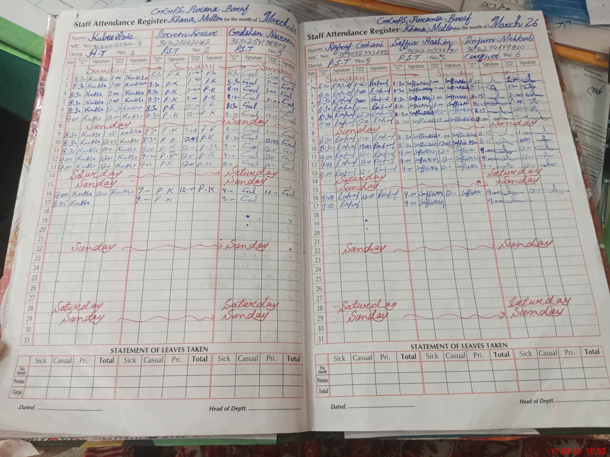 | CNIC | Full Name | Designation | R/C | Absence During Last Calender Month |