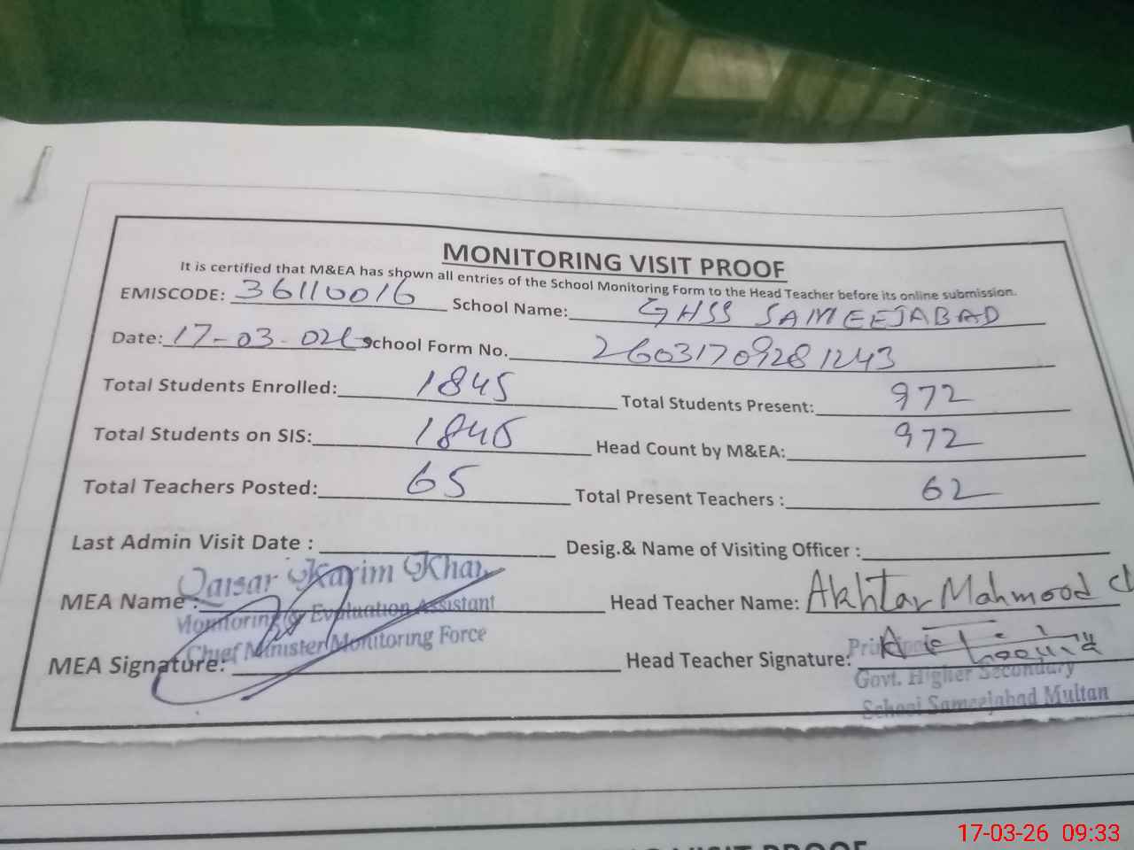 | EMIS Code: 36110016 | Name of School: GHSS SAMEEJABAD MULTAN | |||