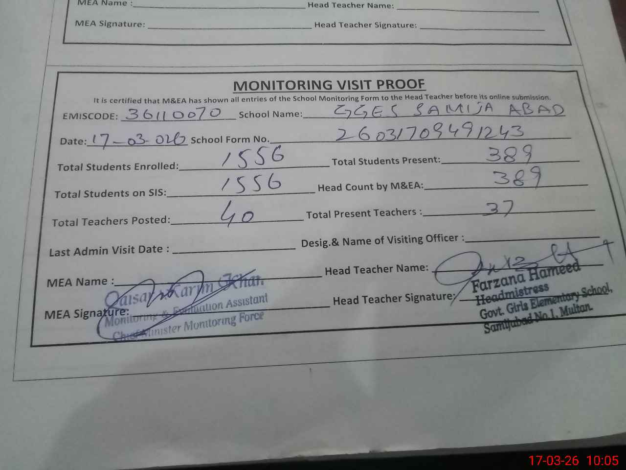 | EMIS Code: 36110070 | Name of School: GGES SAMIJABAD NO.1 MULTAN | |||