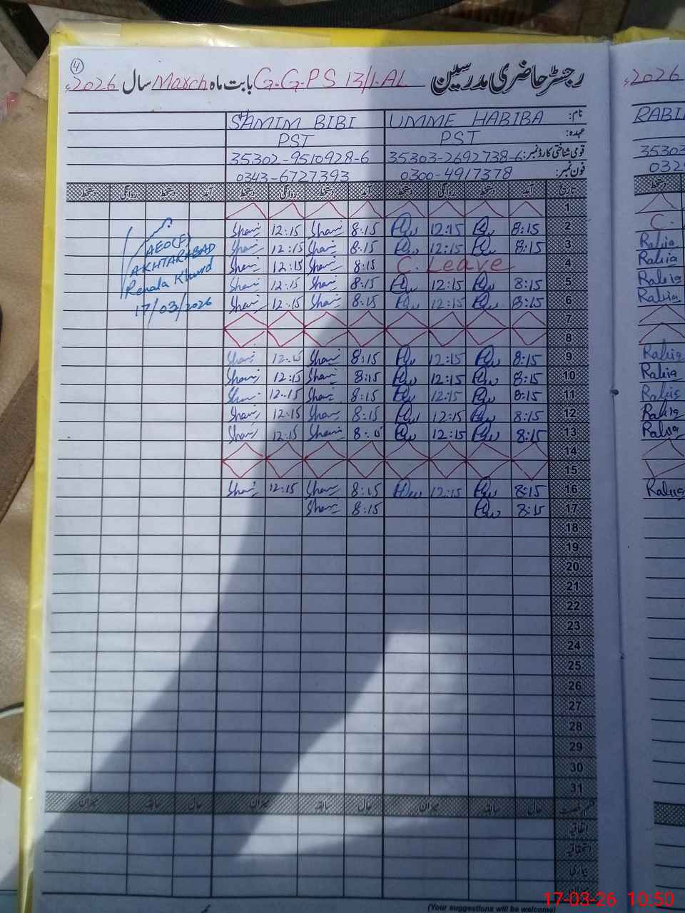 | CNIC | Full Name | Designation | R/C | Absence During Last Calender Month |