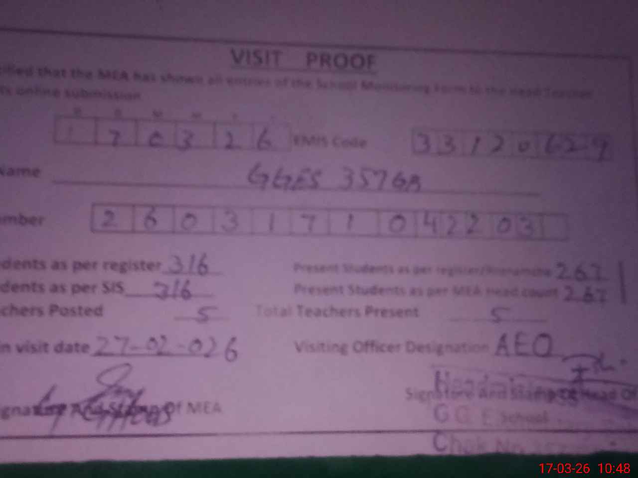 | Attendance Register | Head Teacher | MEA with School | Visit Proof |
