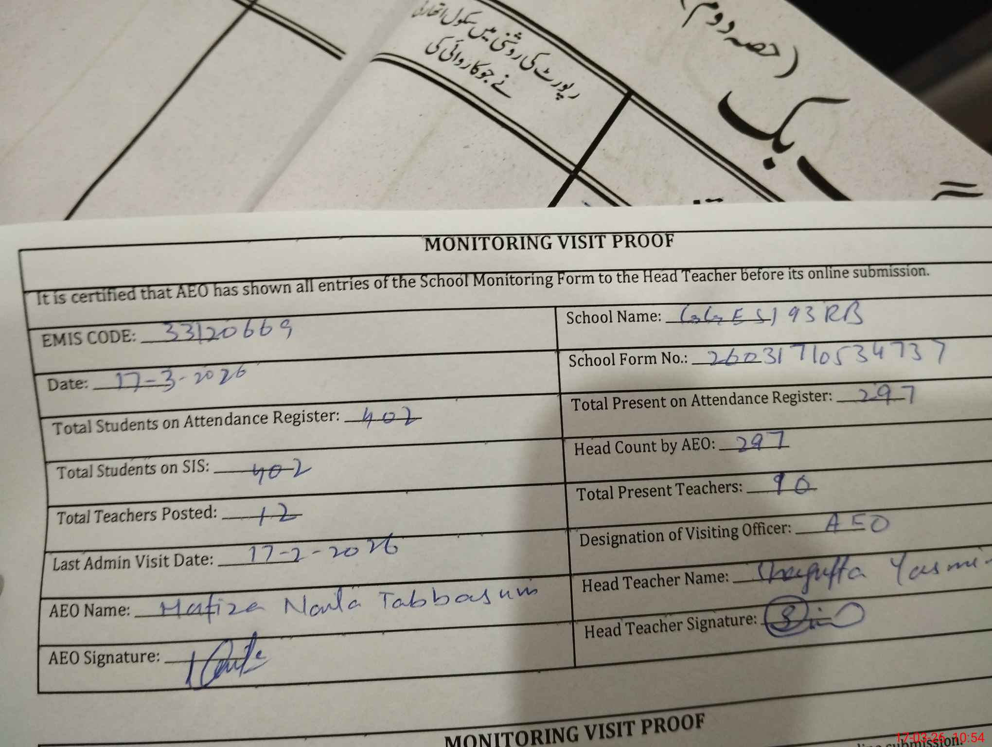 | Attendance Register | Head Teacher | MEA with School | Visit Proof |