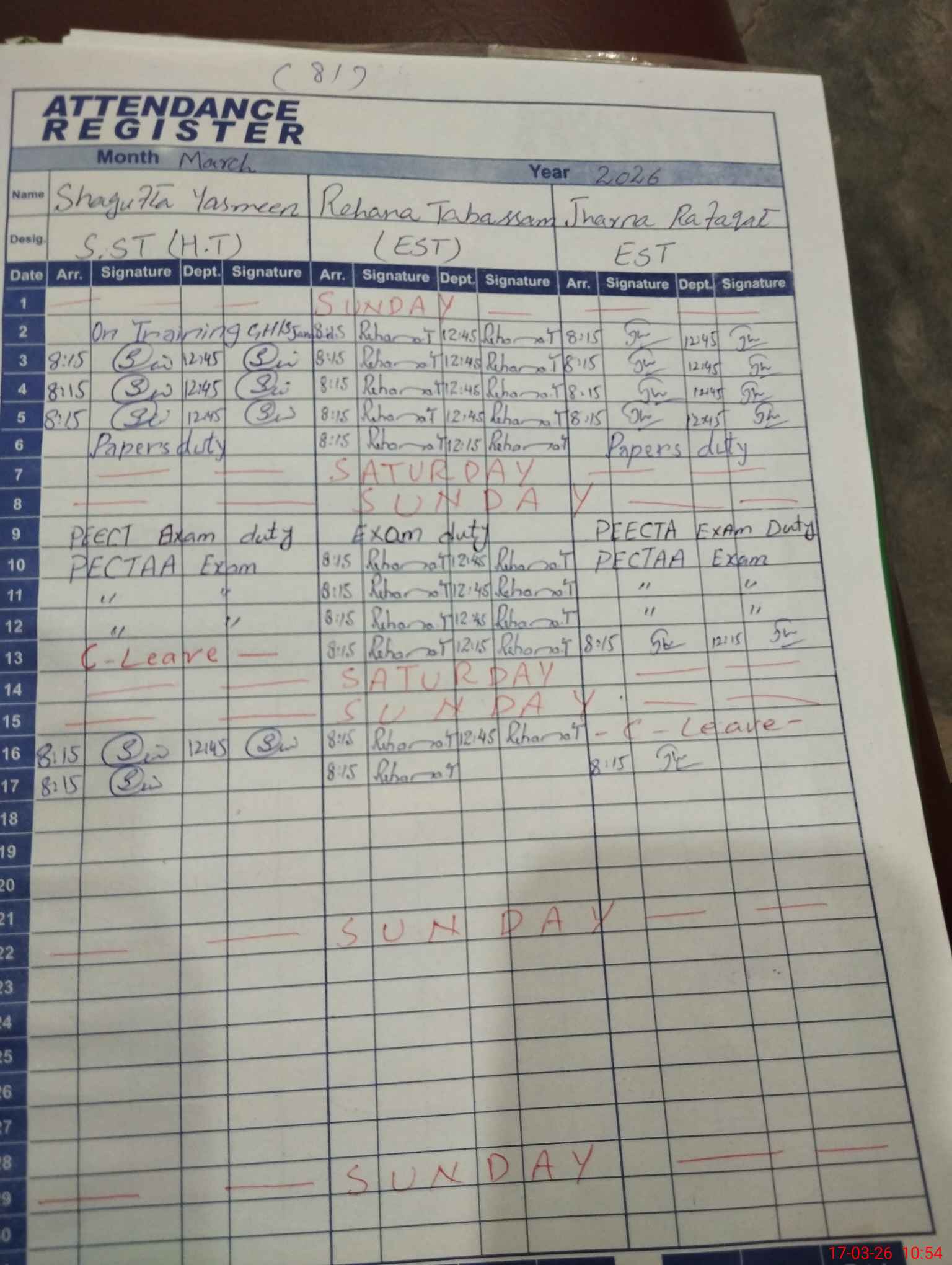 | CNIC | Full Name | Designation | R/C | Absence During Last Calender Month |