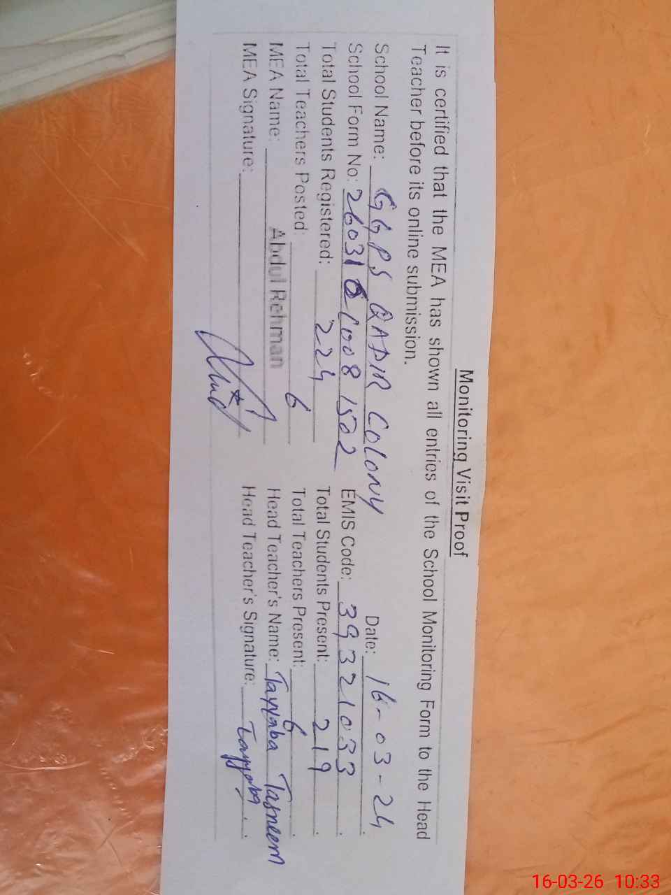 | EMIS Code: 39321033 | Name of School: GGPS QADIR COLONY | |||