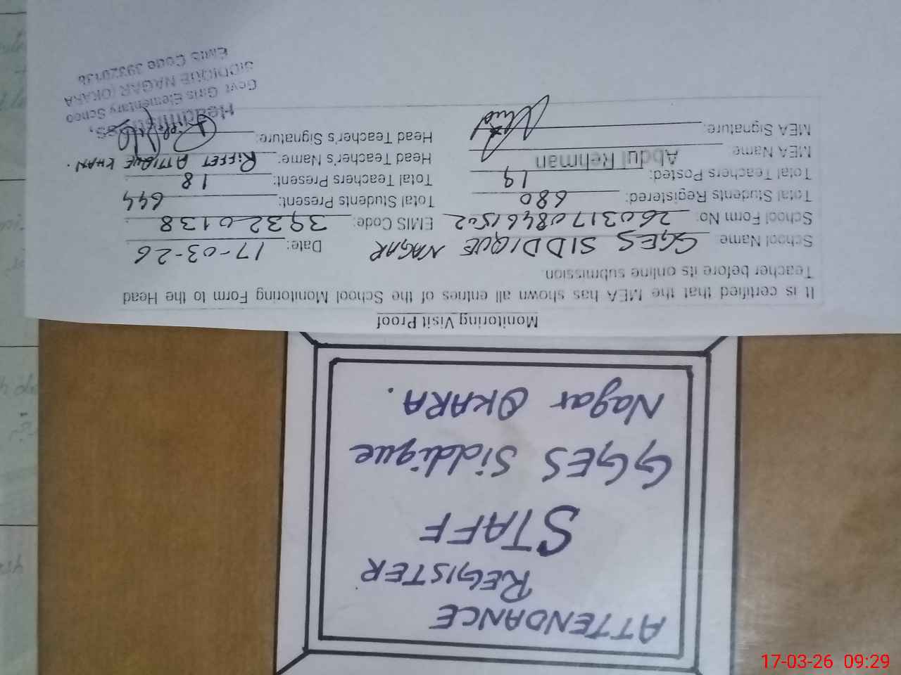 | Attendance Register | Head Teacher | MEA with School | Visit Proof |
