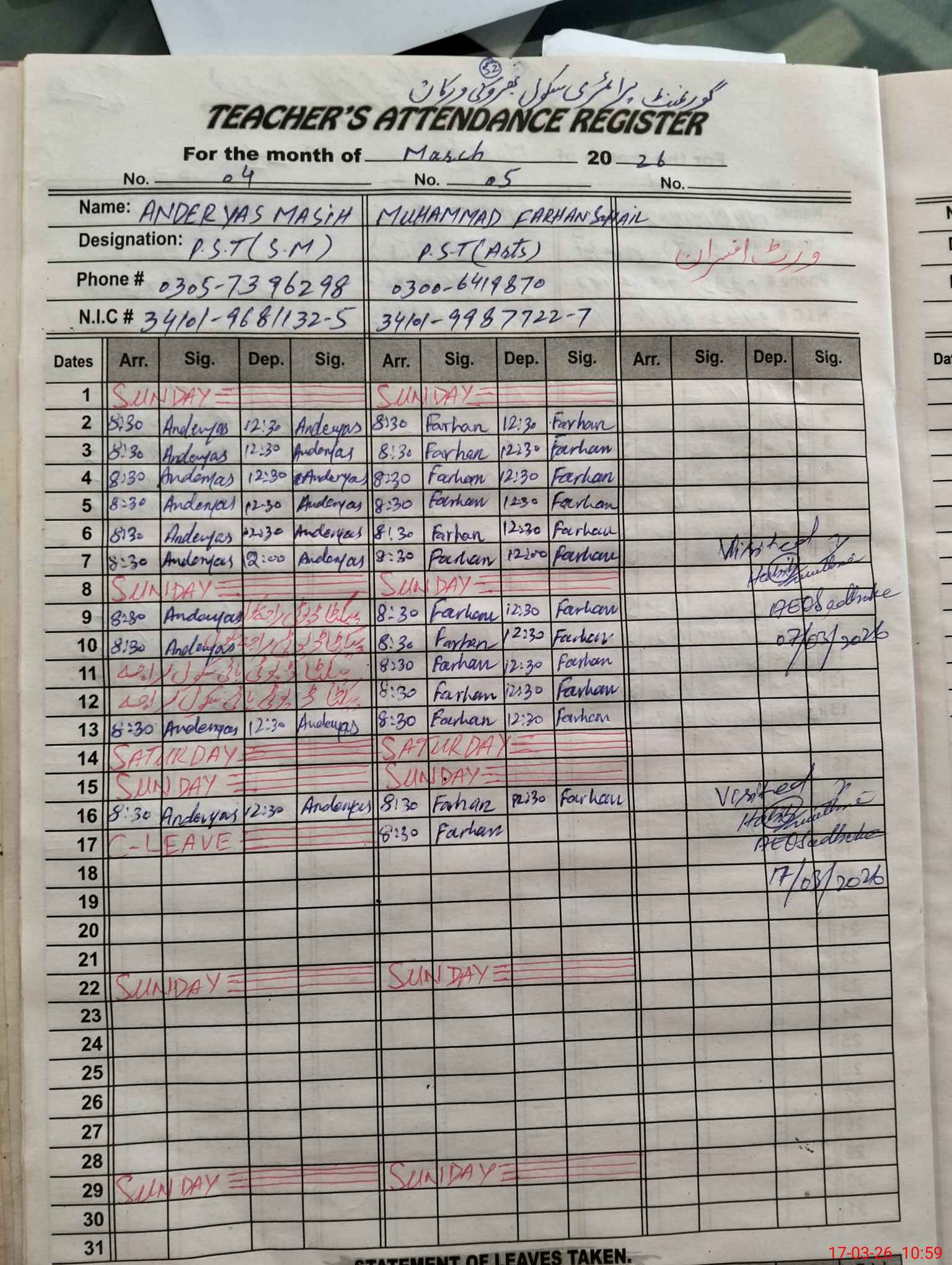 | CNIC | Full Name | Designation | R/C | Absence During Last Calender Month |