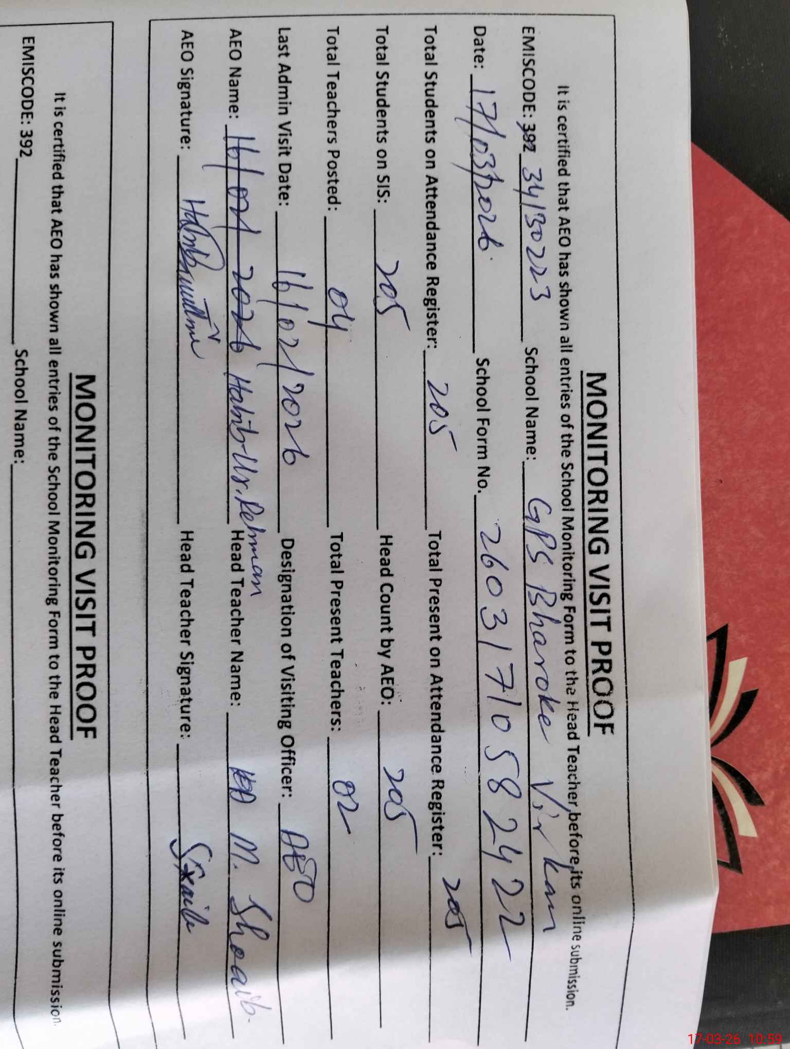| Certified that this School was Inspected by the Undersigned MEA/DMO Today and the Information Stated Above is as Per Record. | |||||