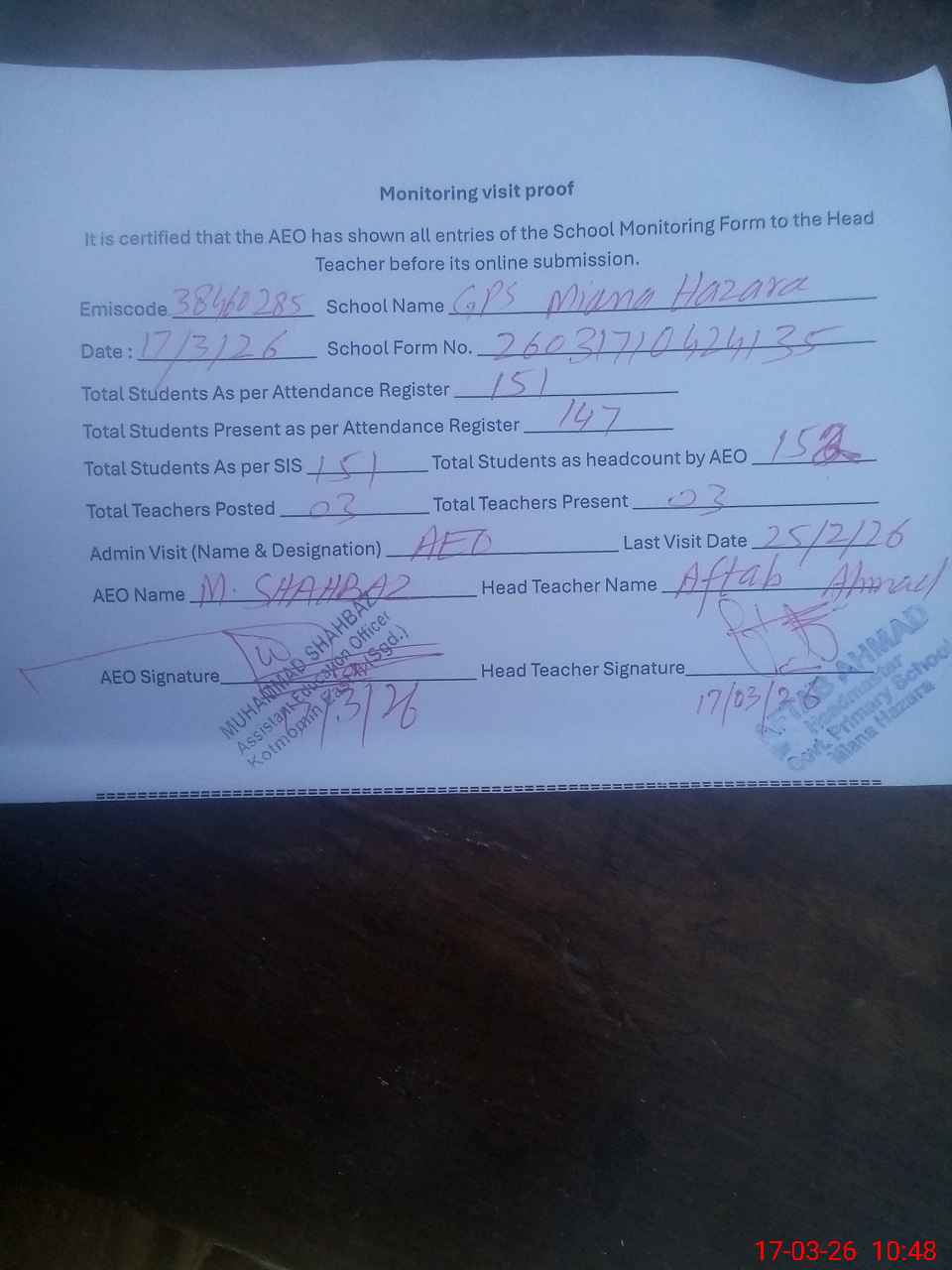 | EMIS Code: 38460285 | Name of School: GPS MIANA HAZARA | |||