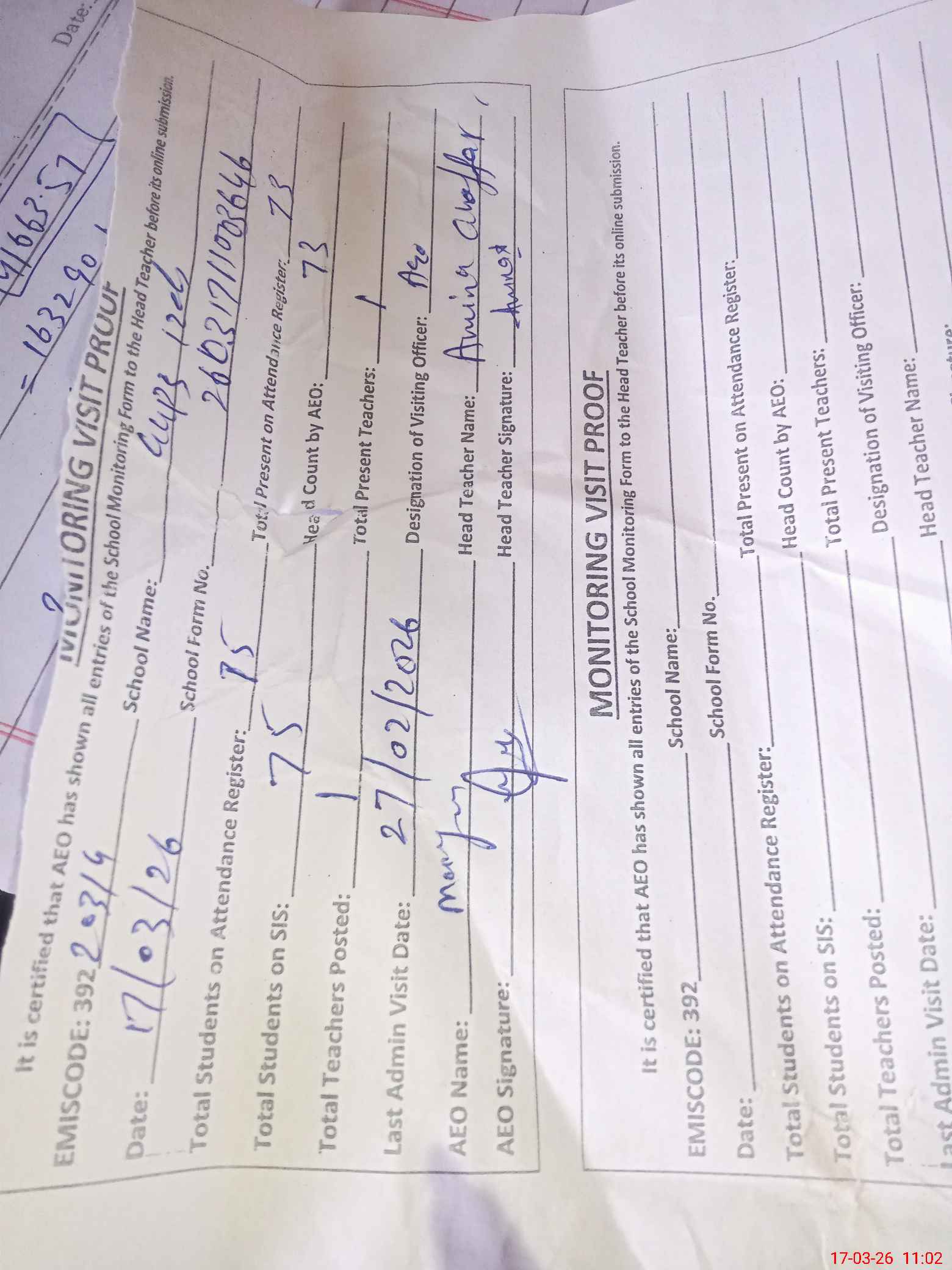 | Attendance Register | Head Teacher | MEA with School | Visit Proof |